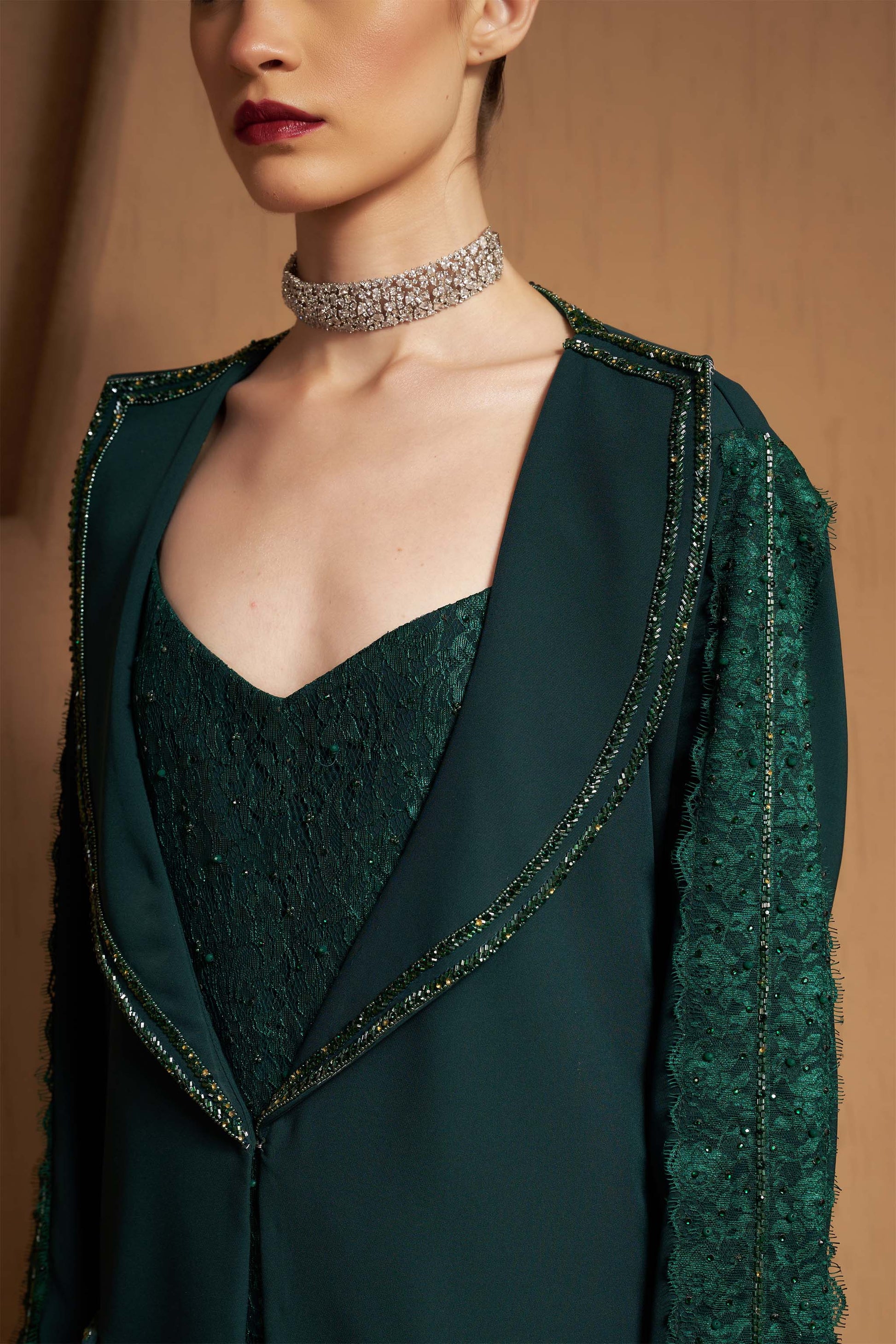 This ensemble includes a tailored fit blazer with flared pants & delicate lace inner top adorned with Premium swarovski crystals with detailed lace with swarovski on the sleeves.