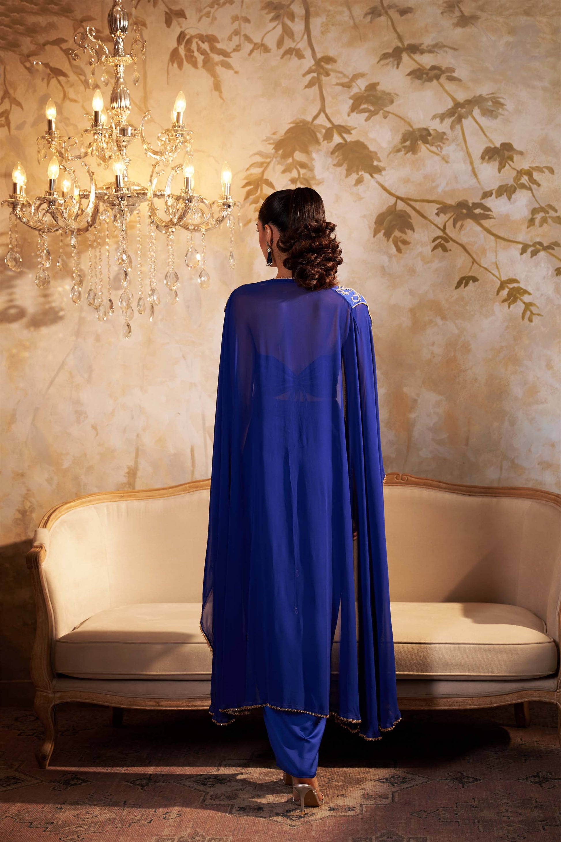 This ensemble features a structured corset, encrusted with shimmering stones for a touch of modern opulence. Paired with a fluid string dhoti-style skirt that drapes effortlessly in front, the look is completed with a sheer organza cape, delicately and artfully embroidered with arm openings for a dramatic, fashion-forward silhouette.