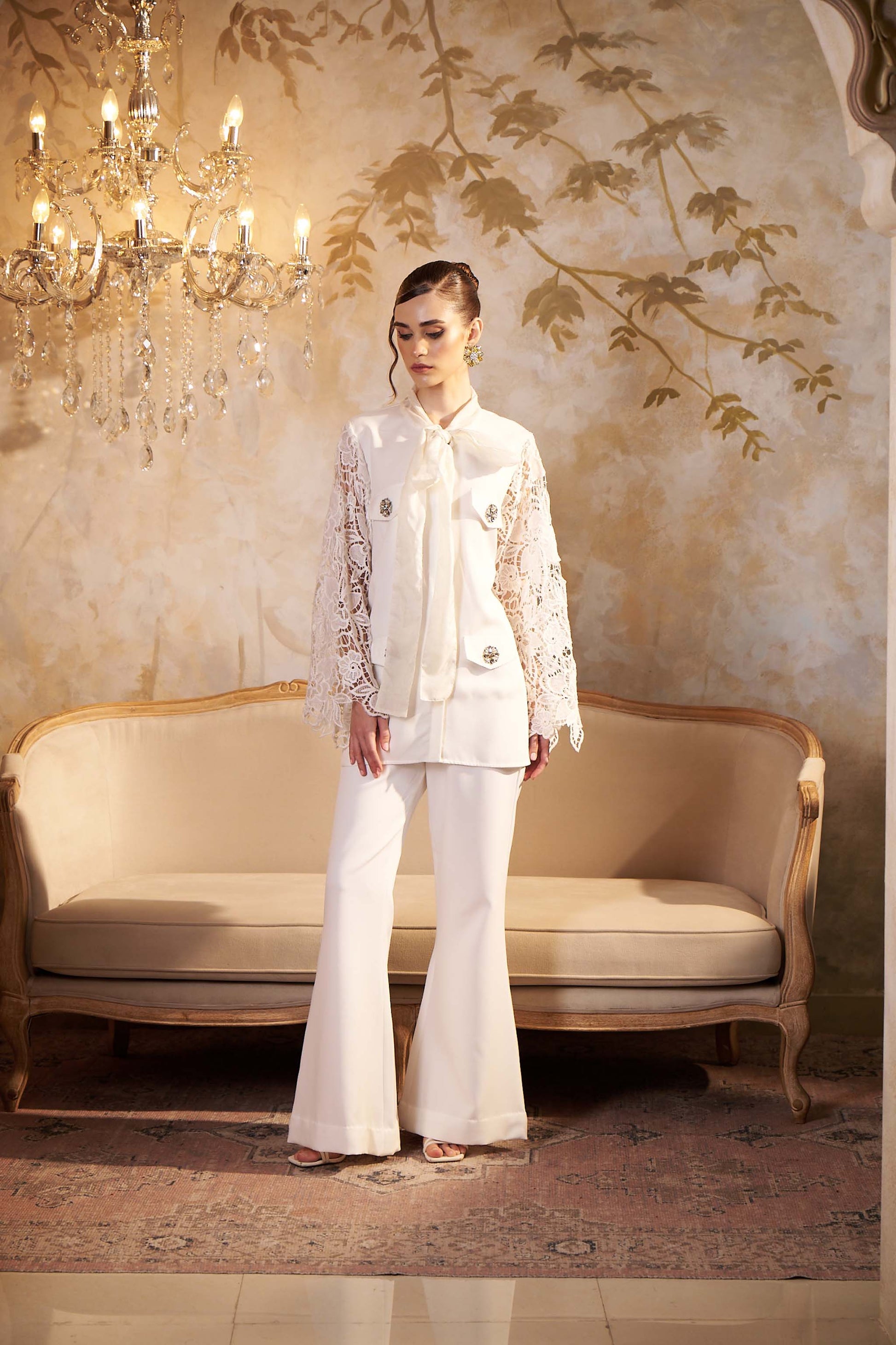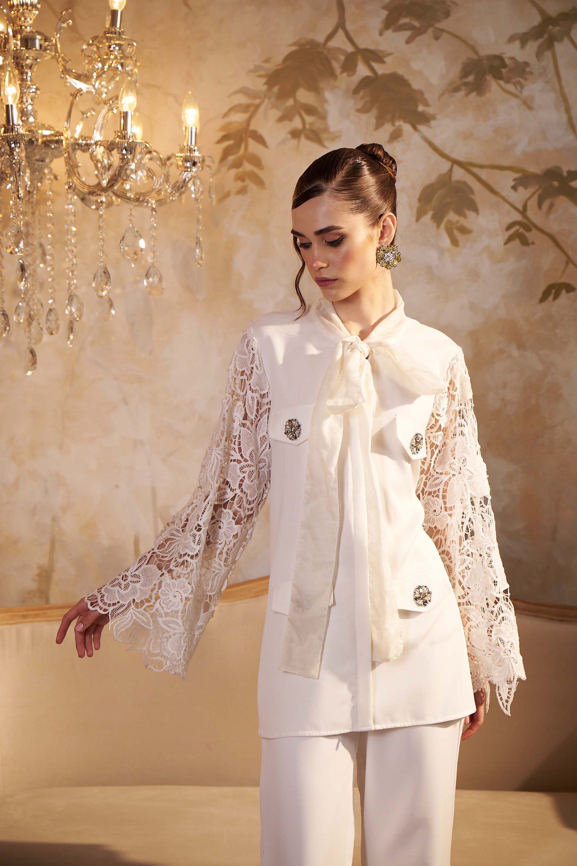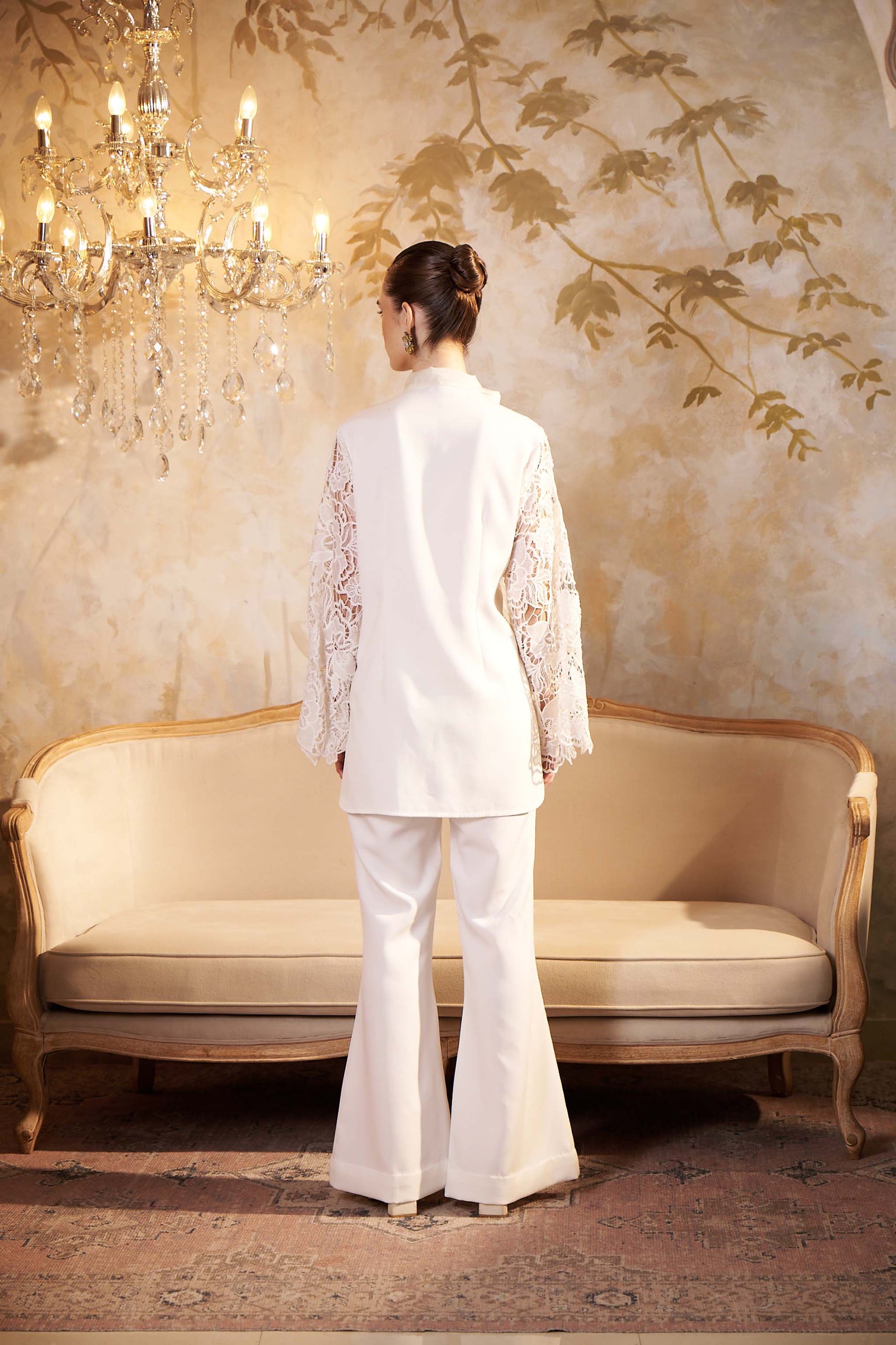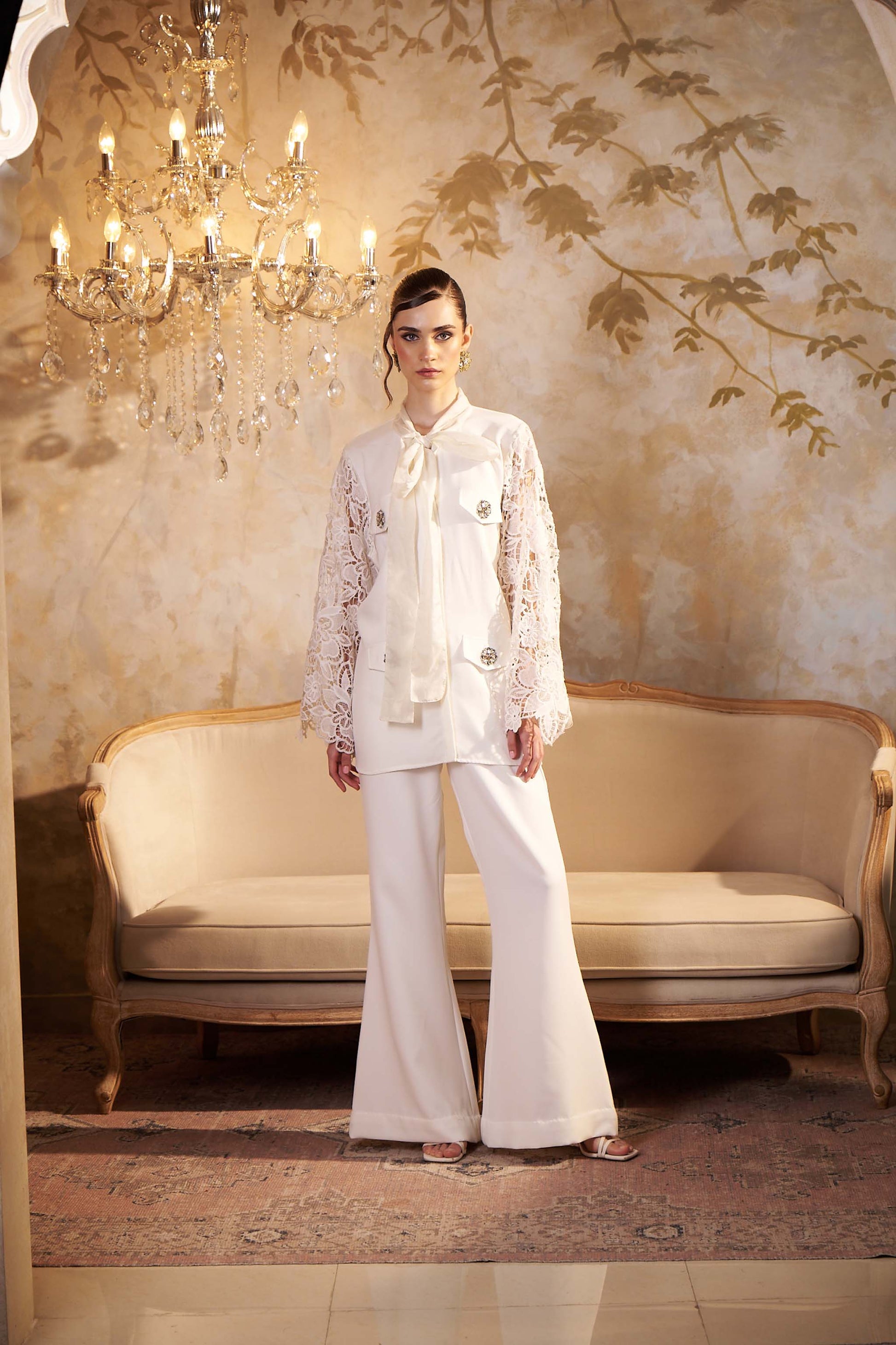 This graceful set features a soft paired with delicate lace sleeves for a touch of romance. The front pockets detailed with stone motifs adding a hint of sparkle, paired with flared pants.