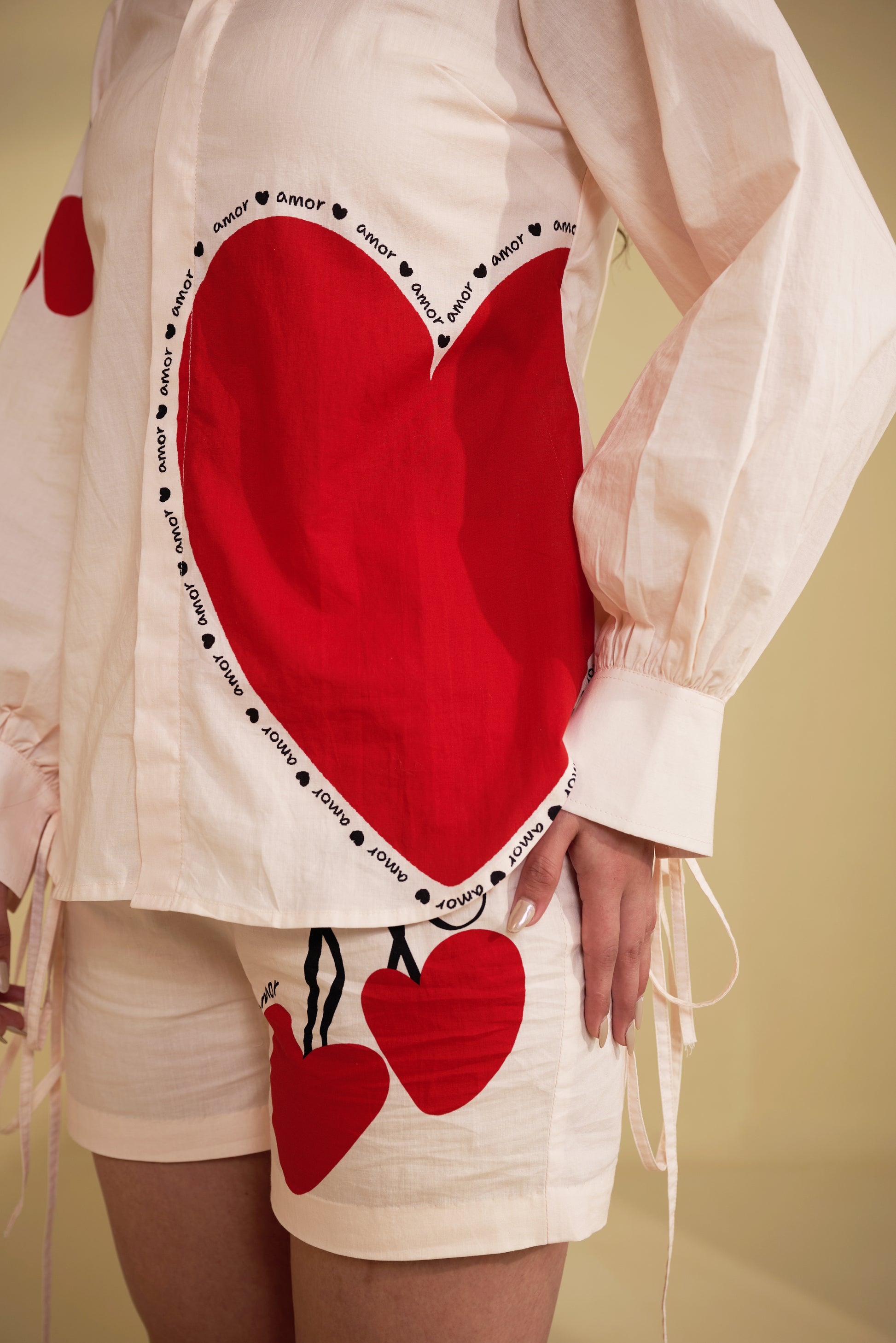 Playful meets polished in blush beige. Adorned with heart and cherry motifs in rich red , crafted in soft breathable fabric , perfect for everyday ease .