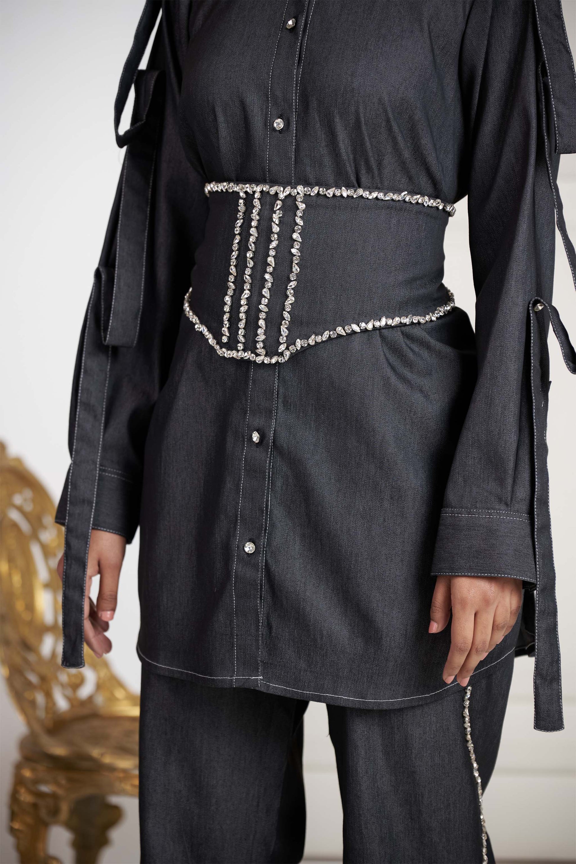 The coord set features a thick belt, intricately detailed with shimmering stones on the belt and along the straight pant sides.