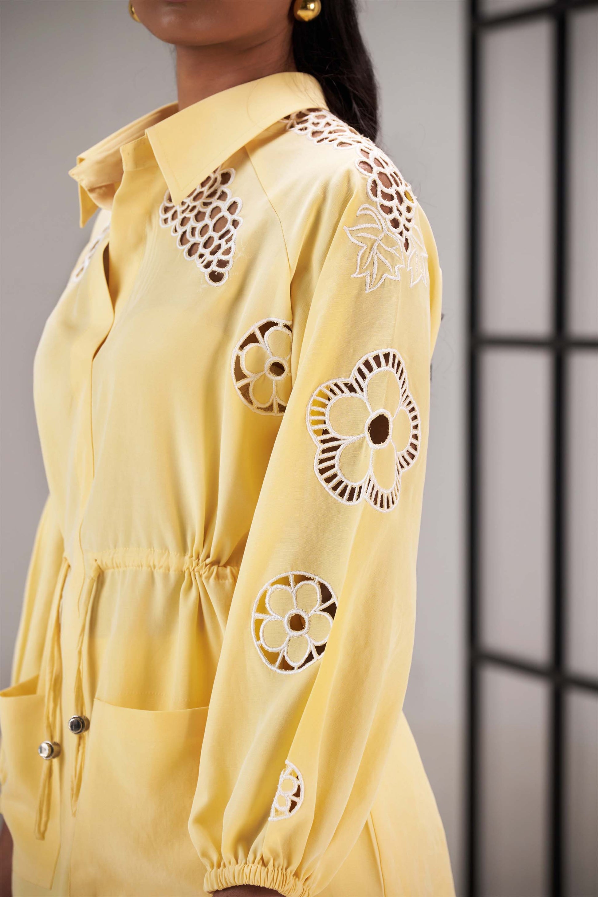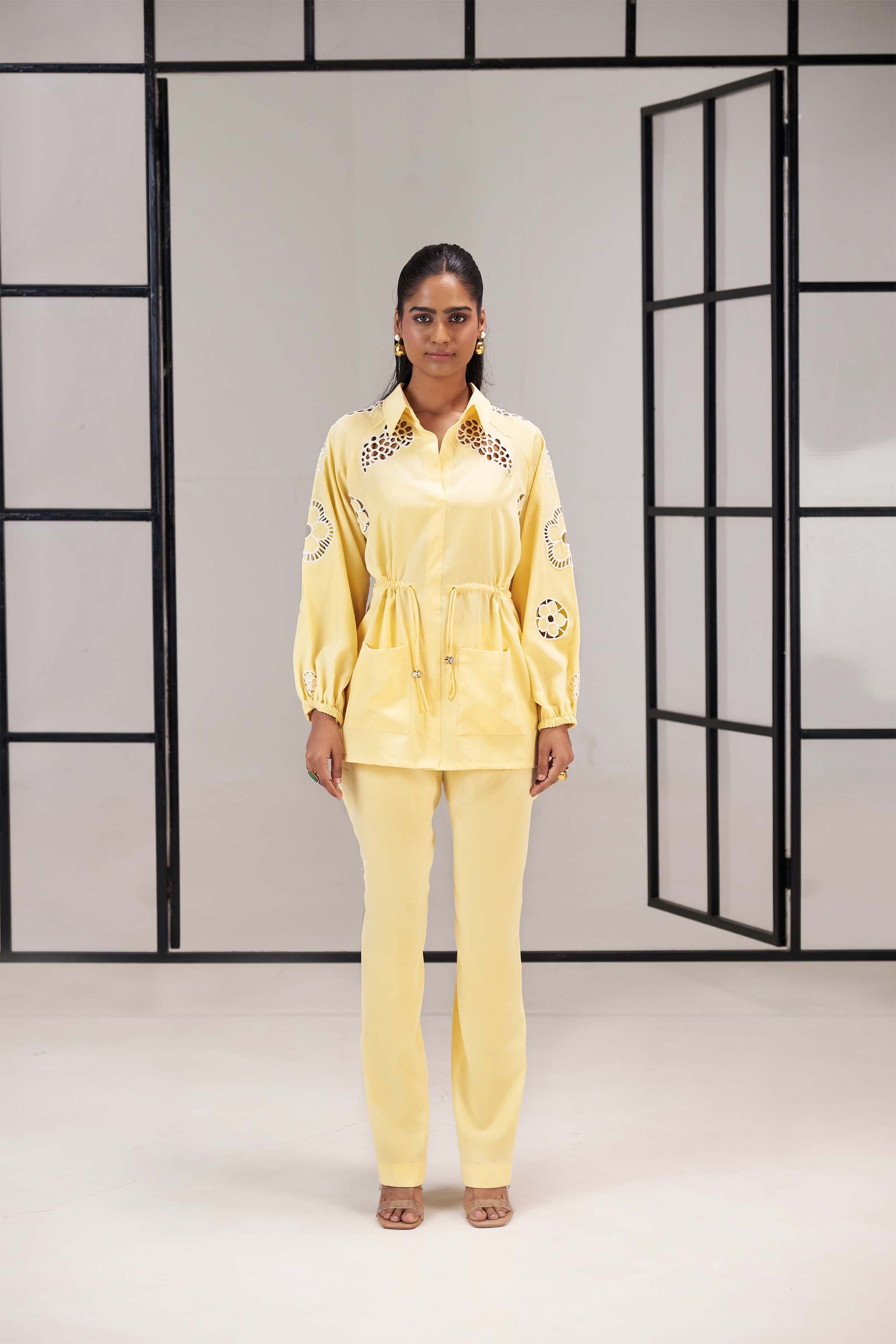 Elegant linen straight pants with hand cutwork embroidery on the shirt front and sleeves, with an adjustable drawstring waistline.