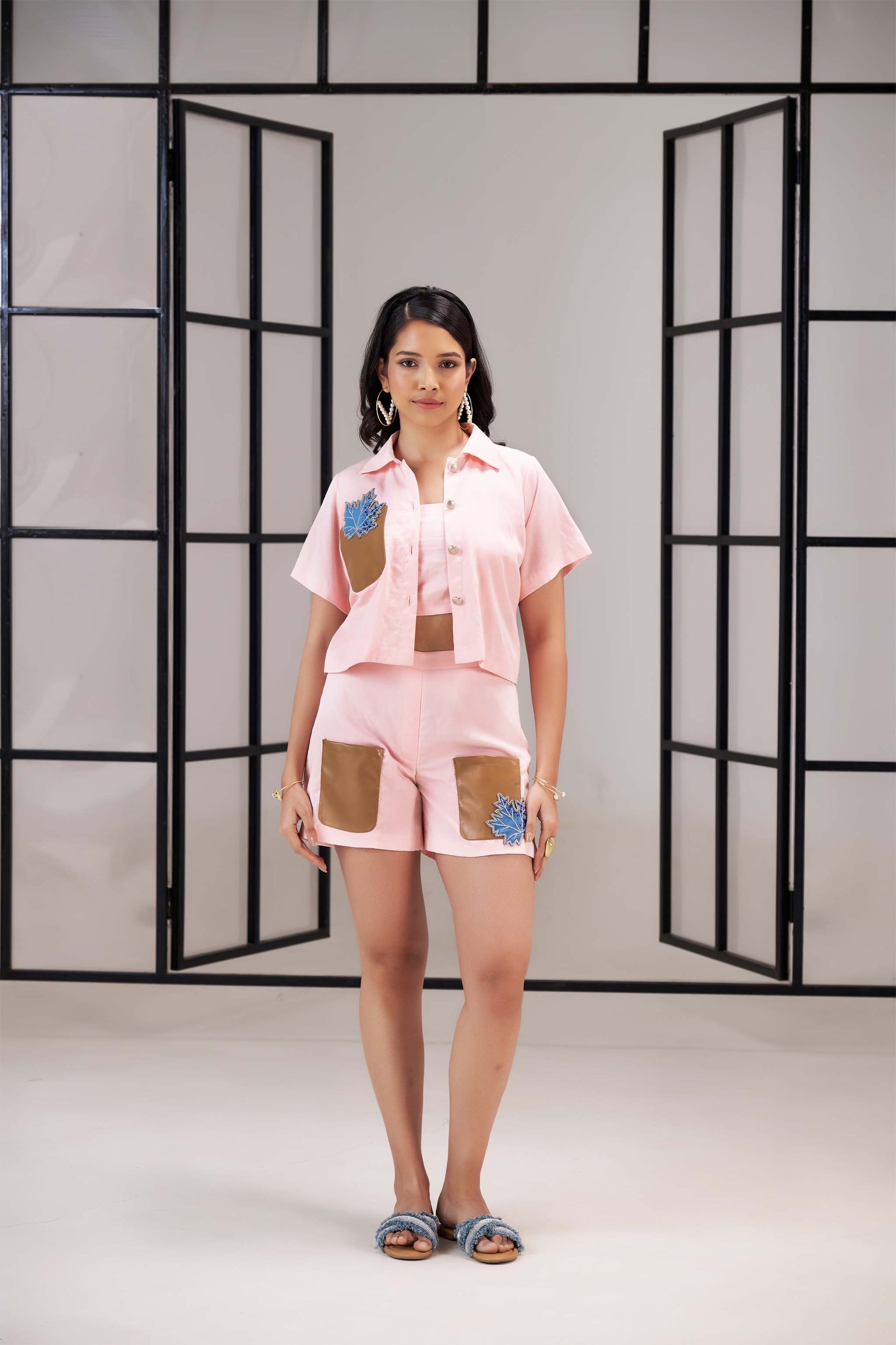 Three-piece linen set features a sleek bustier, layered with a short shirt and matching shorts—both accented with statement leather pockets, adorned with small maple leaf embroidered motifs.