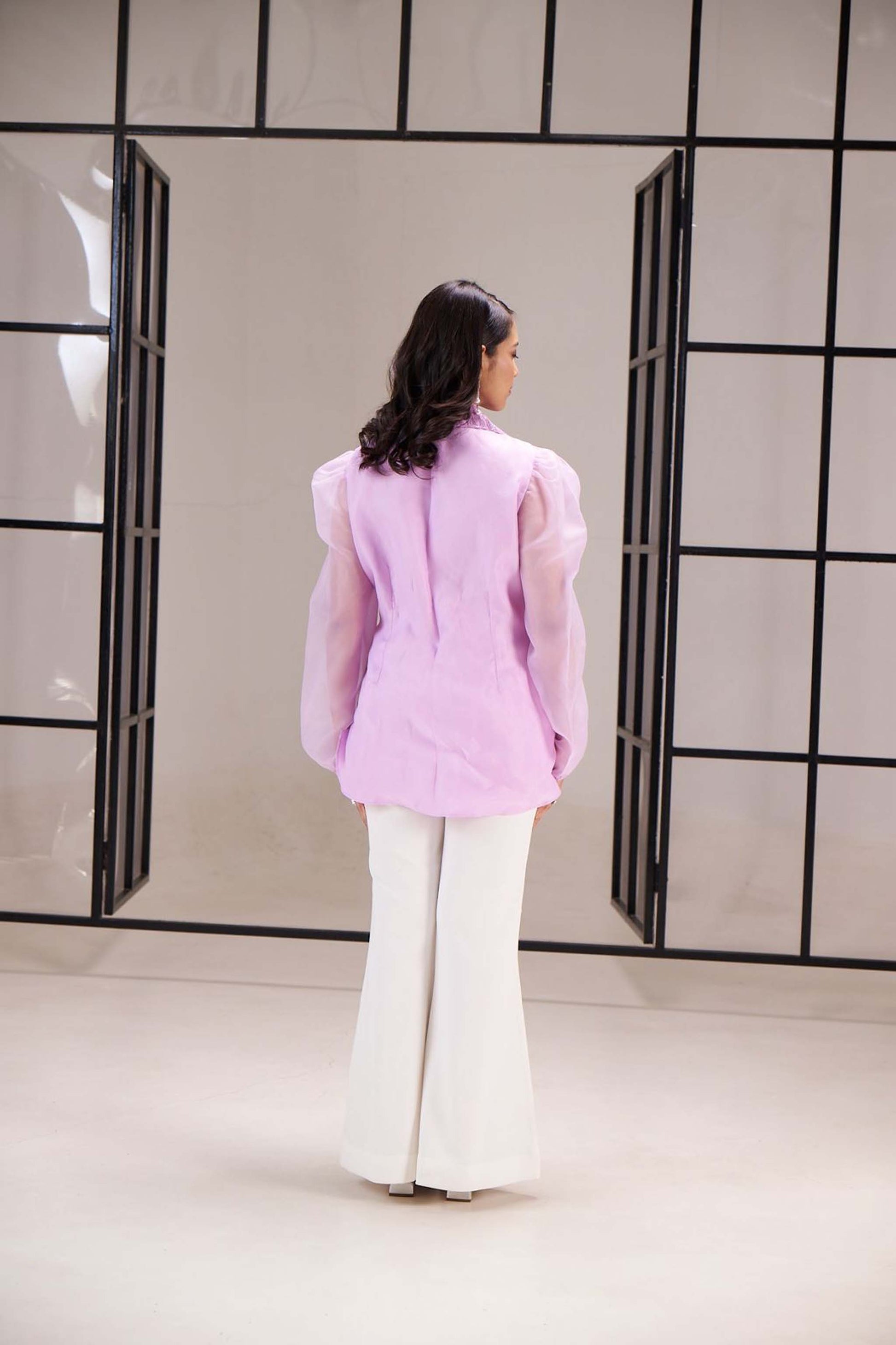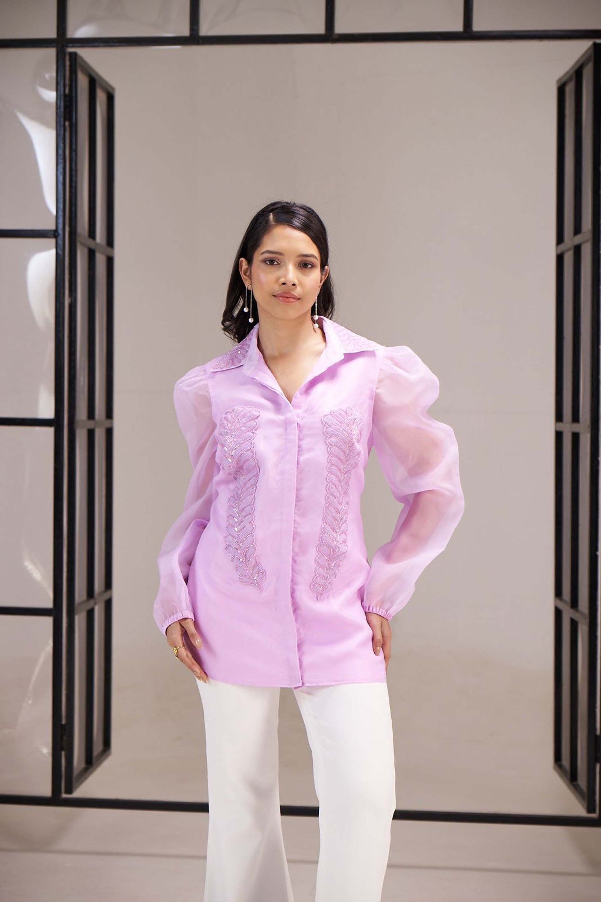 Organza shirt featuring subtle thread embroidery, accented with bead work.