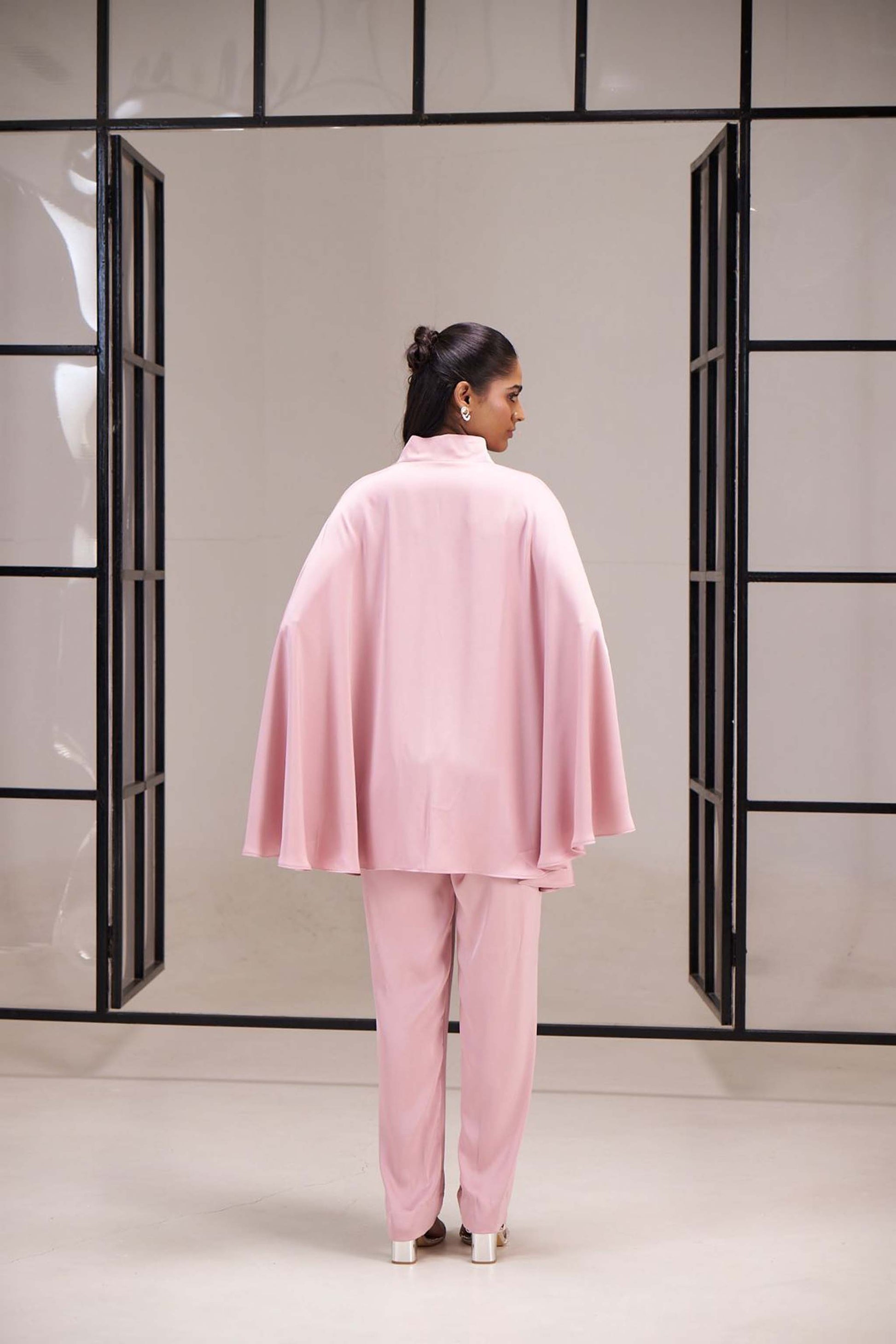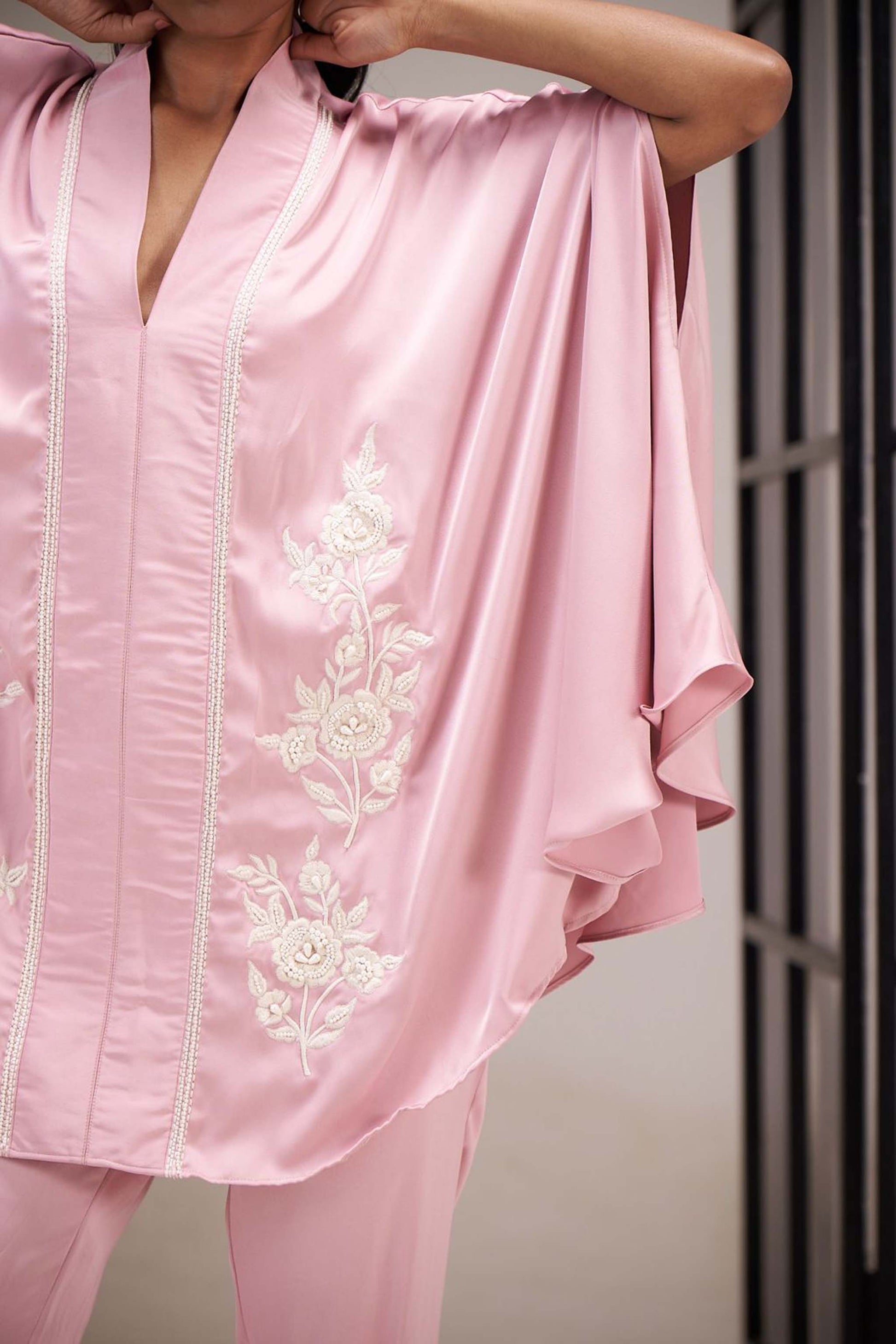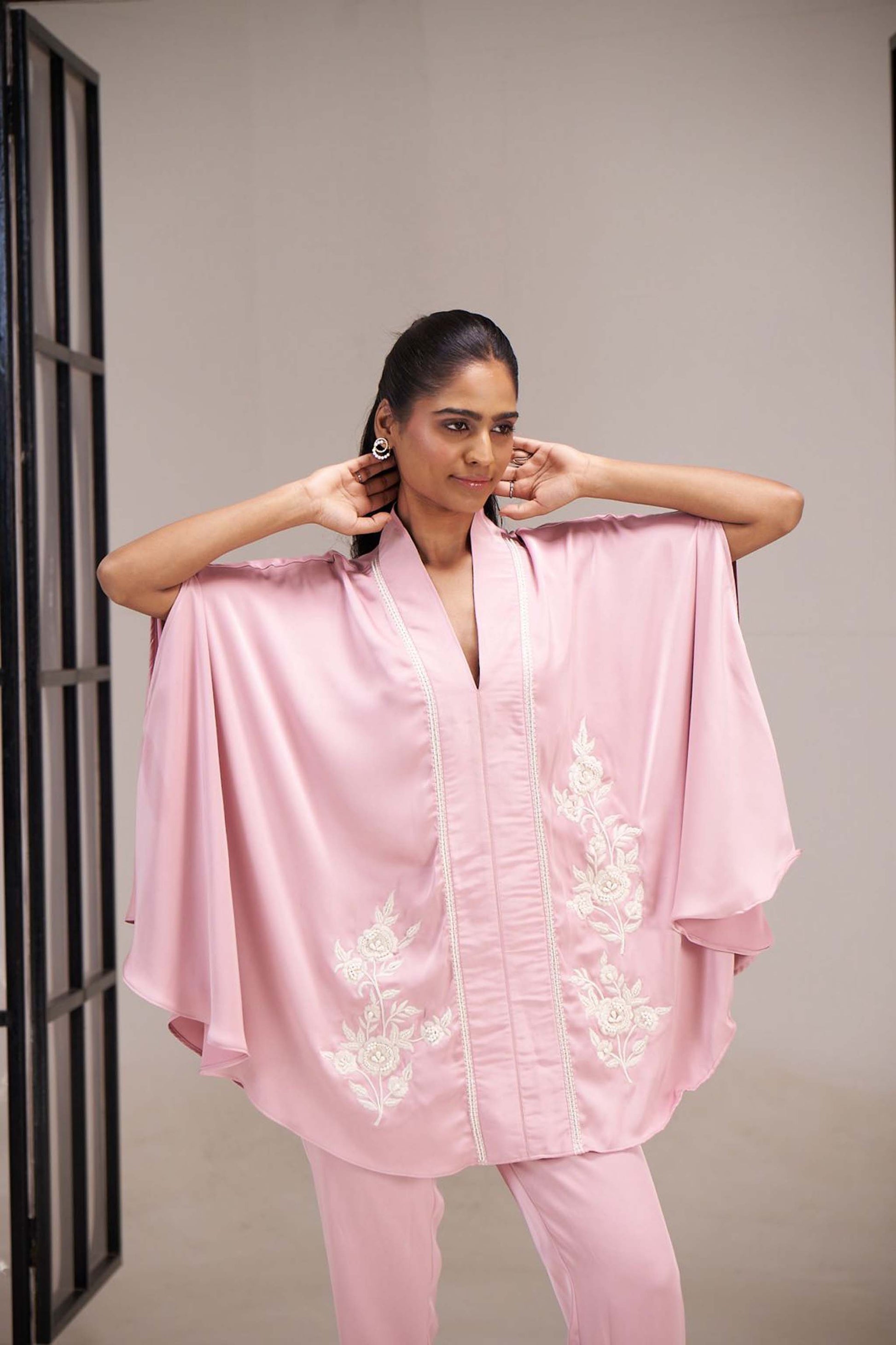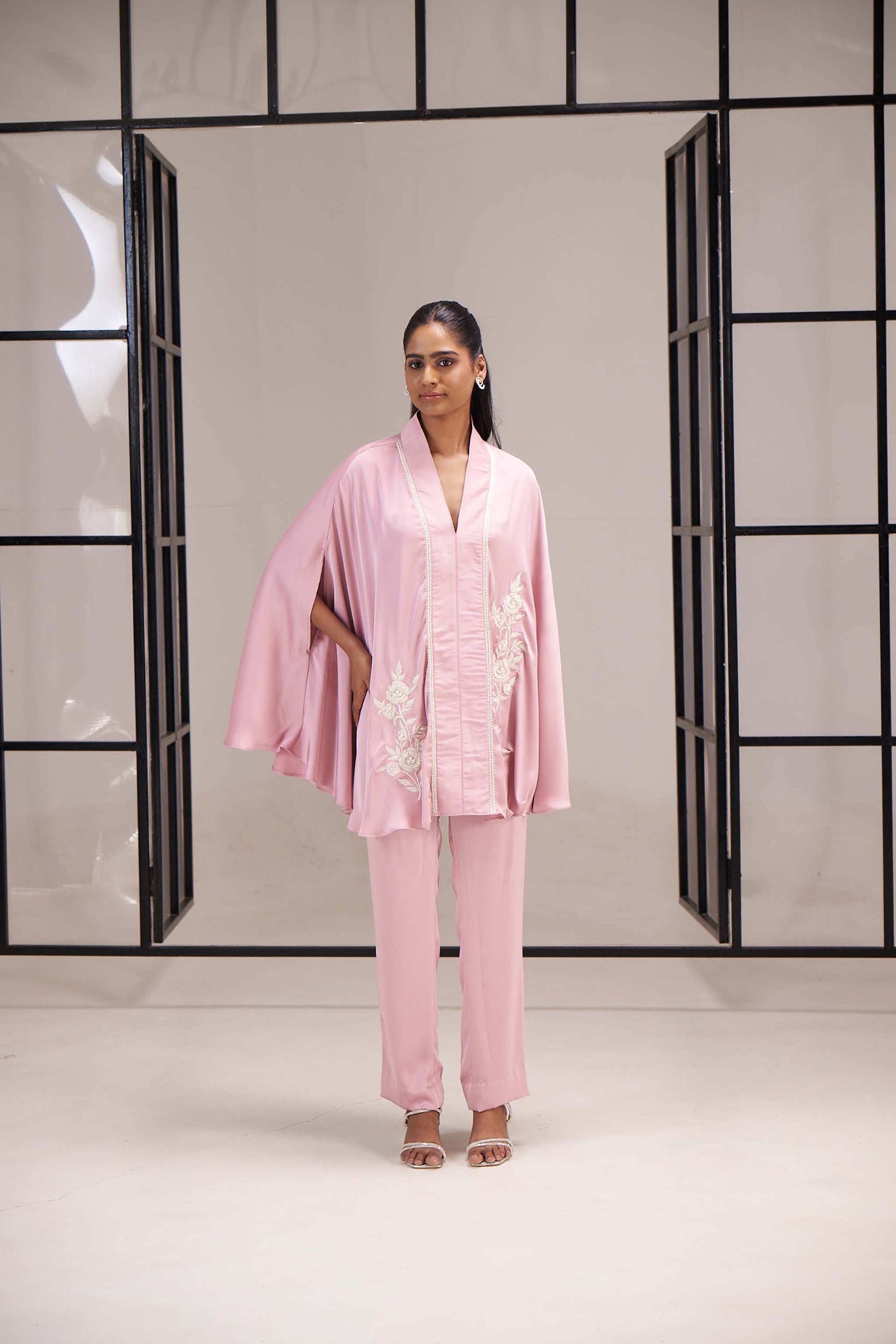A masterpiece in refined elegance, this cape showcases delicate pearl embroidery across the front, highlighted by sumptuous pearl-embroidered floral motifs that exude timeless luxury. Its flowing silhouette pairs seamlessly with tailored straight pants, achieving a perfect balance of grandeur and modern sophistication.