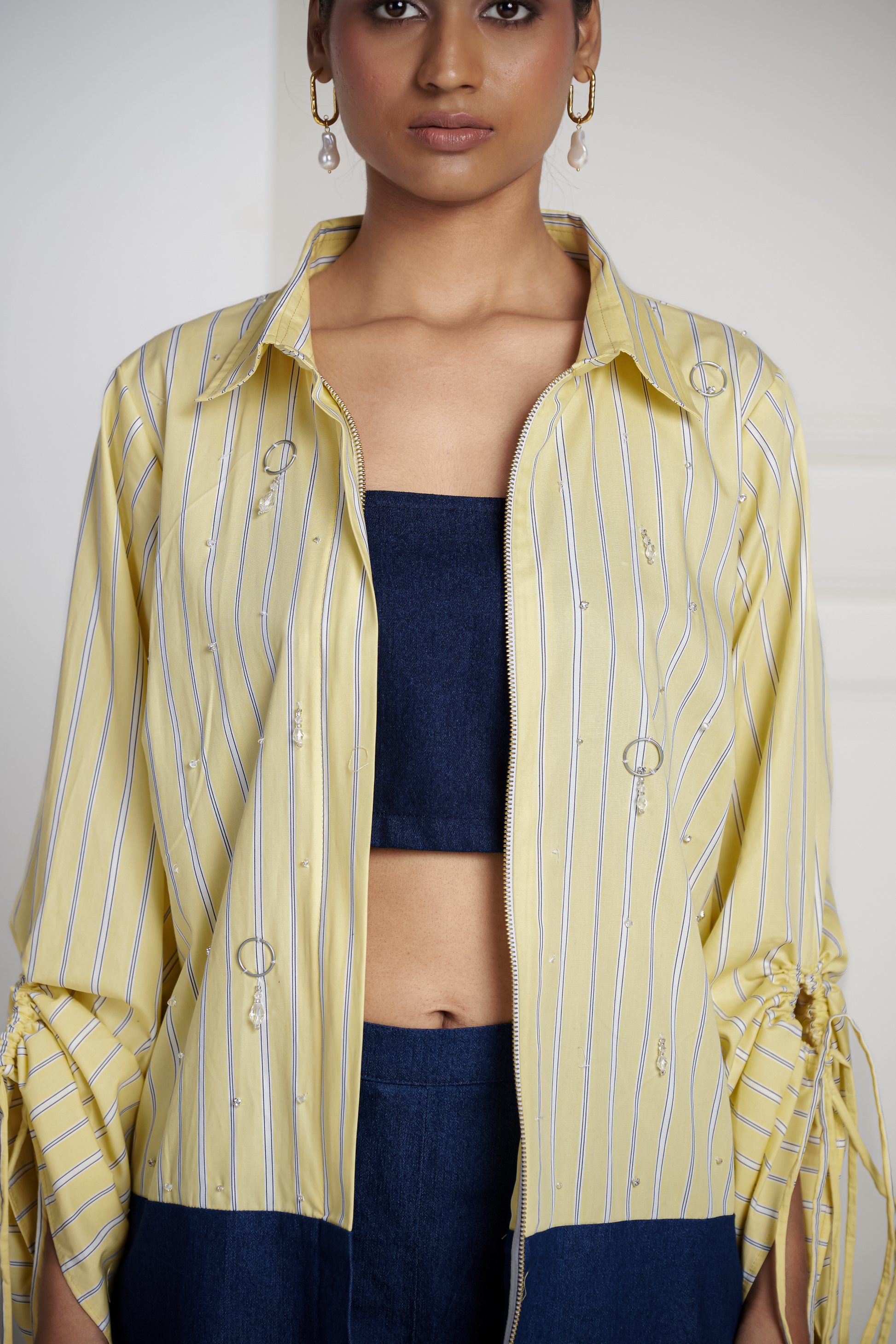 This striped coord set features a half-striped, half-denim silver-embellished zipper shirt, layered over a denim bustier.