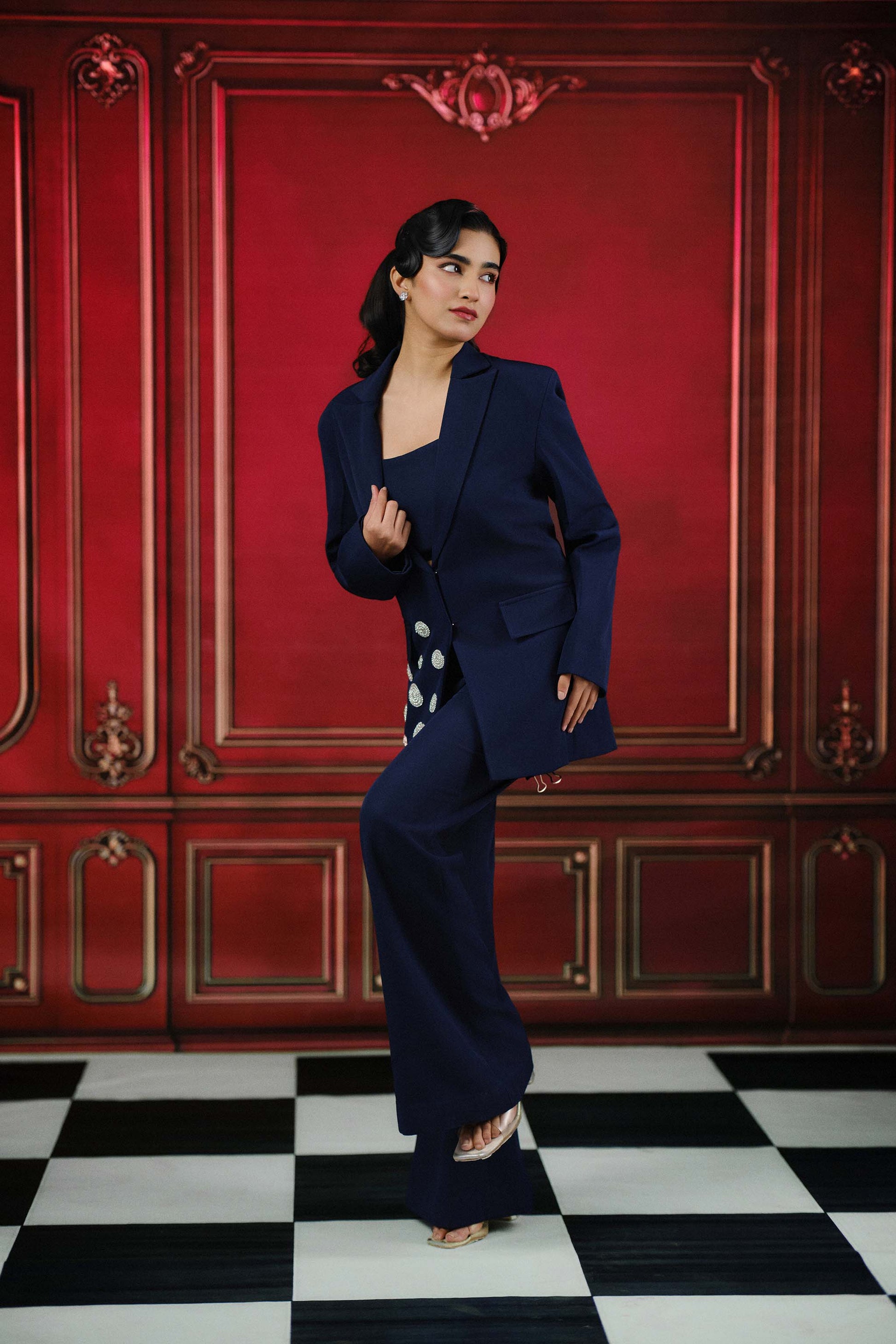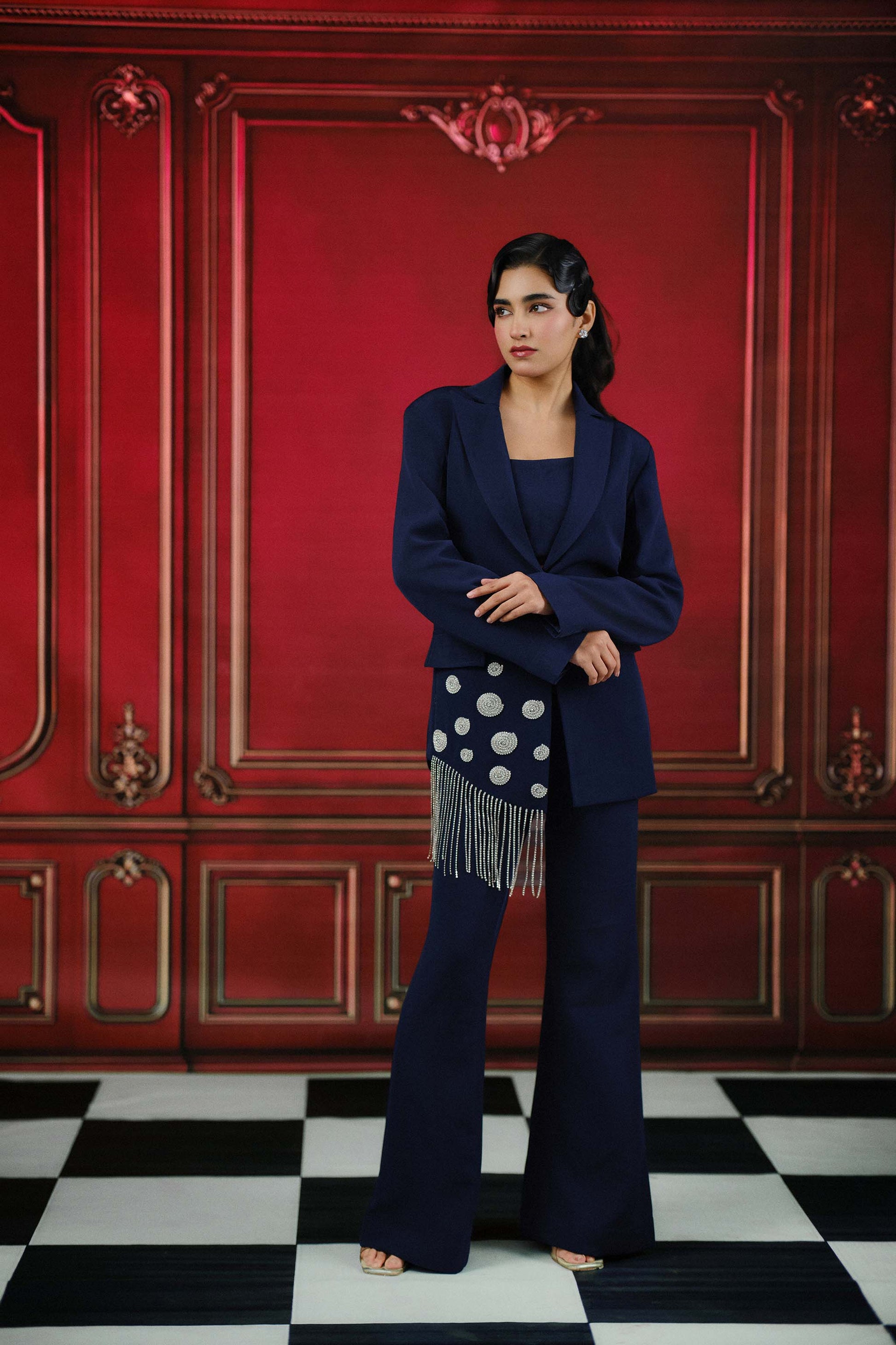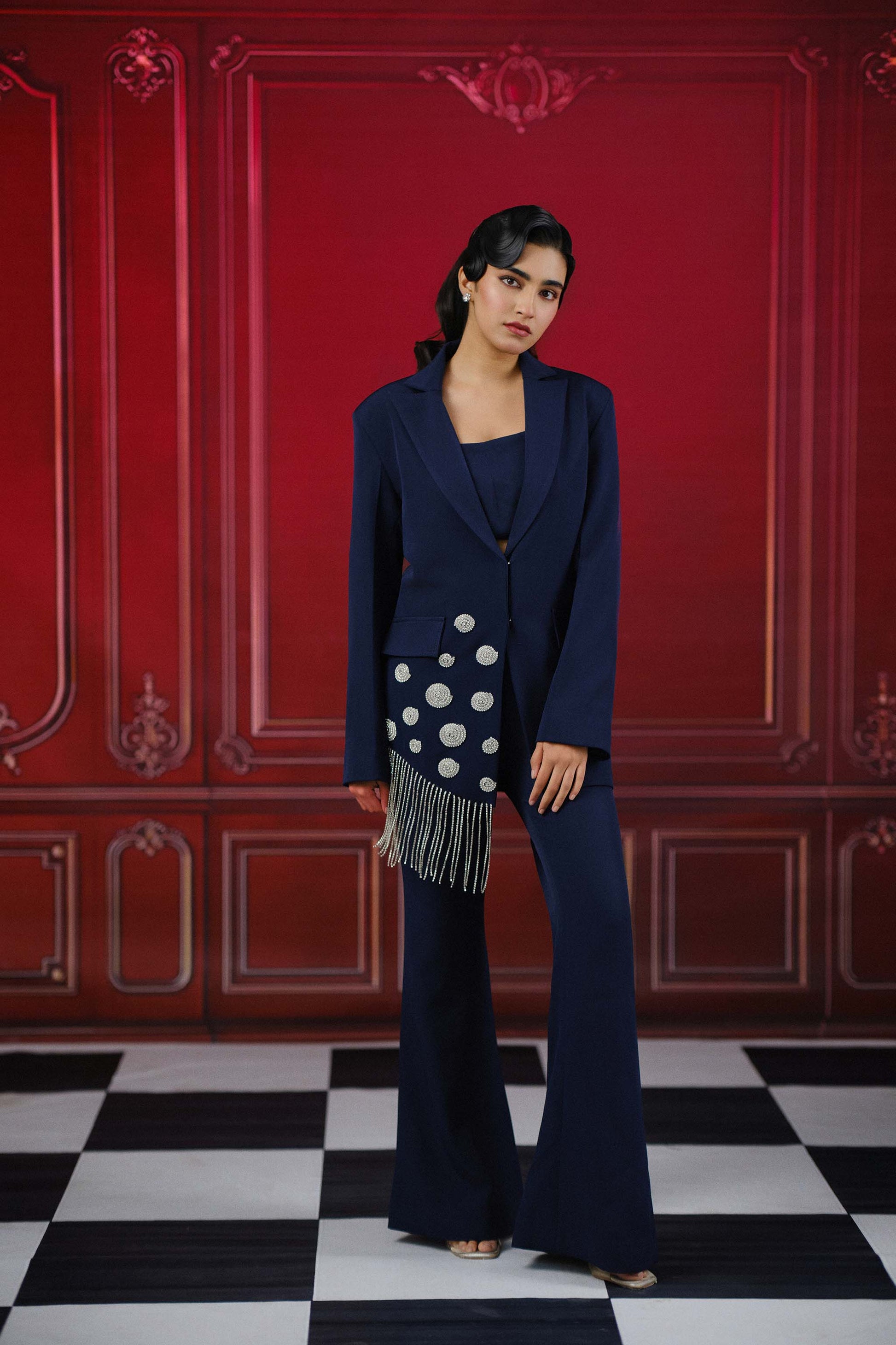 Elevate your look with this coordinated balzer srt adorned with sparkling crystal detailing and chain hanging accents, paired with wide leg trousers and a striking fitted bustier for a striking ensemble.