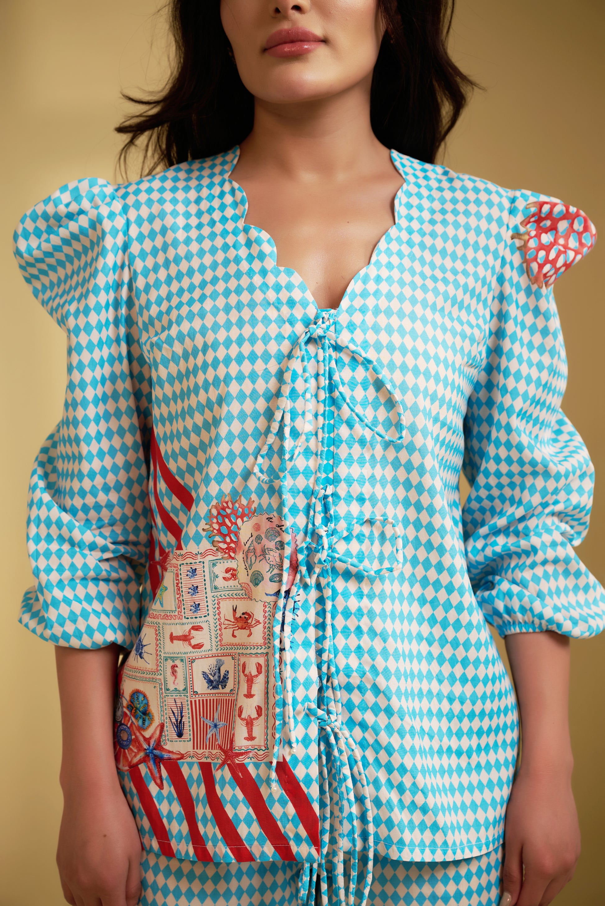 A effortless style featuring a unique prism printed pattern infused with delicately hand drawn marine creatures. this print blends geometric precision with an underwater dreamscape which is refreshing and statement making.