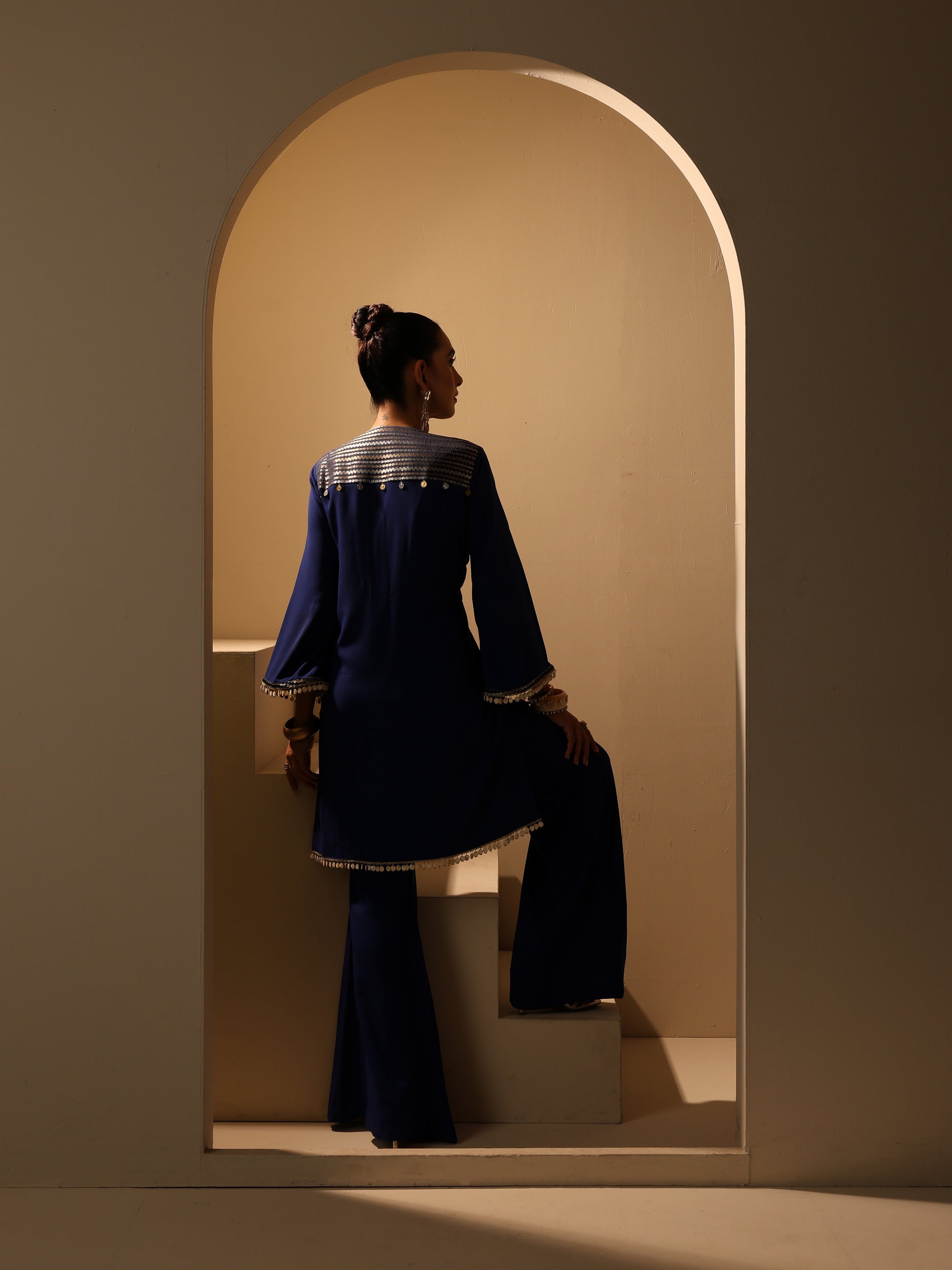A striking blue high low set elevated with handcrafted metal mebellishments and delicate pearl accents , paired with bell bottom pants, it exudes modern festive charm.