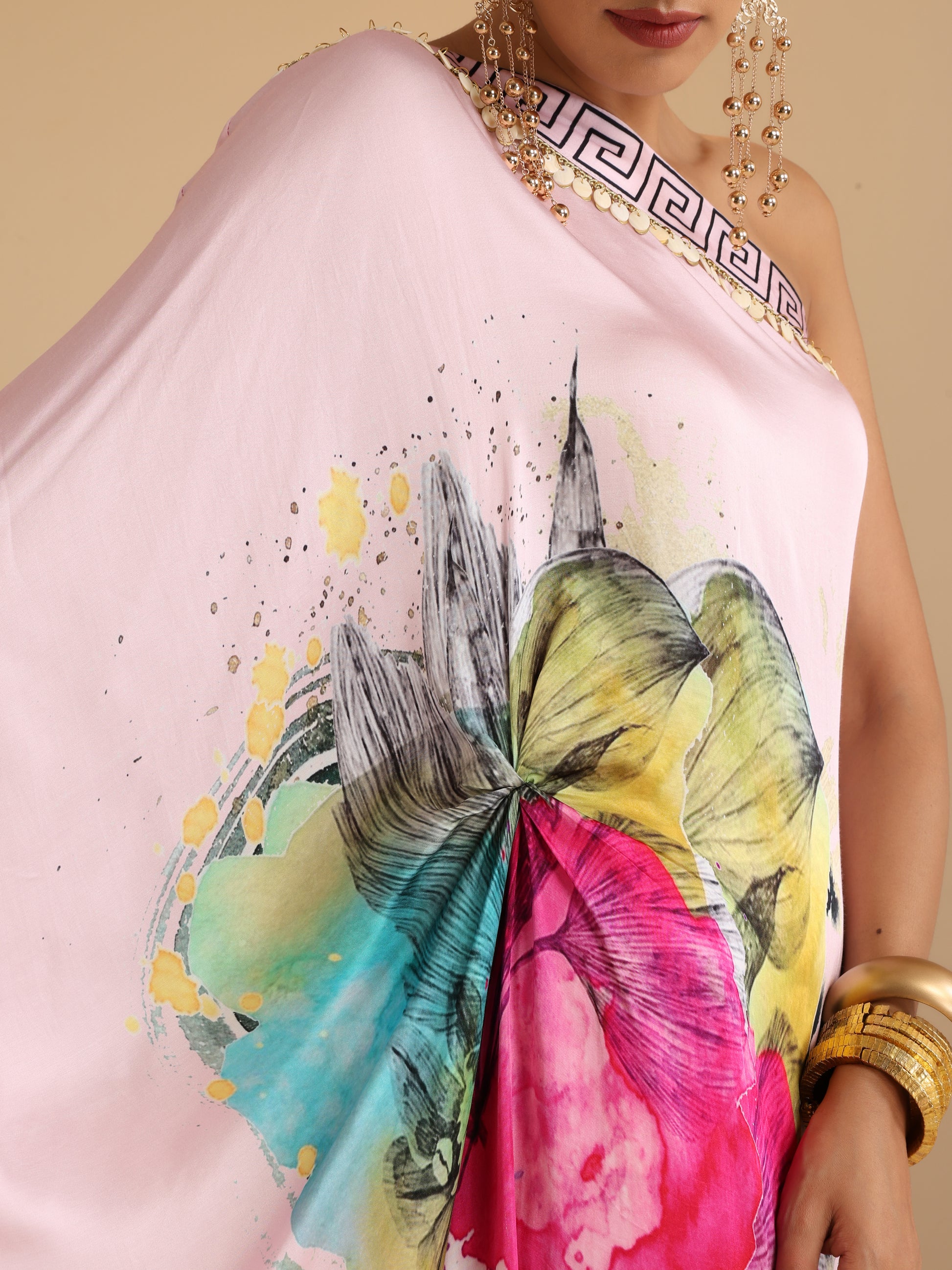 A powder pink one shoulder kaftan featuring a fluid drape and handpainted abstract multicolored print . Effortlessly elegant and striking luxe . A stateemnt piece that blends with modern silhouette