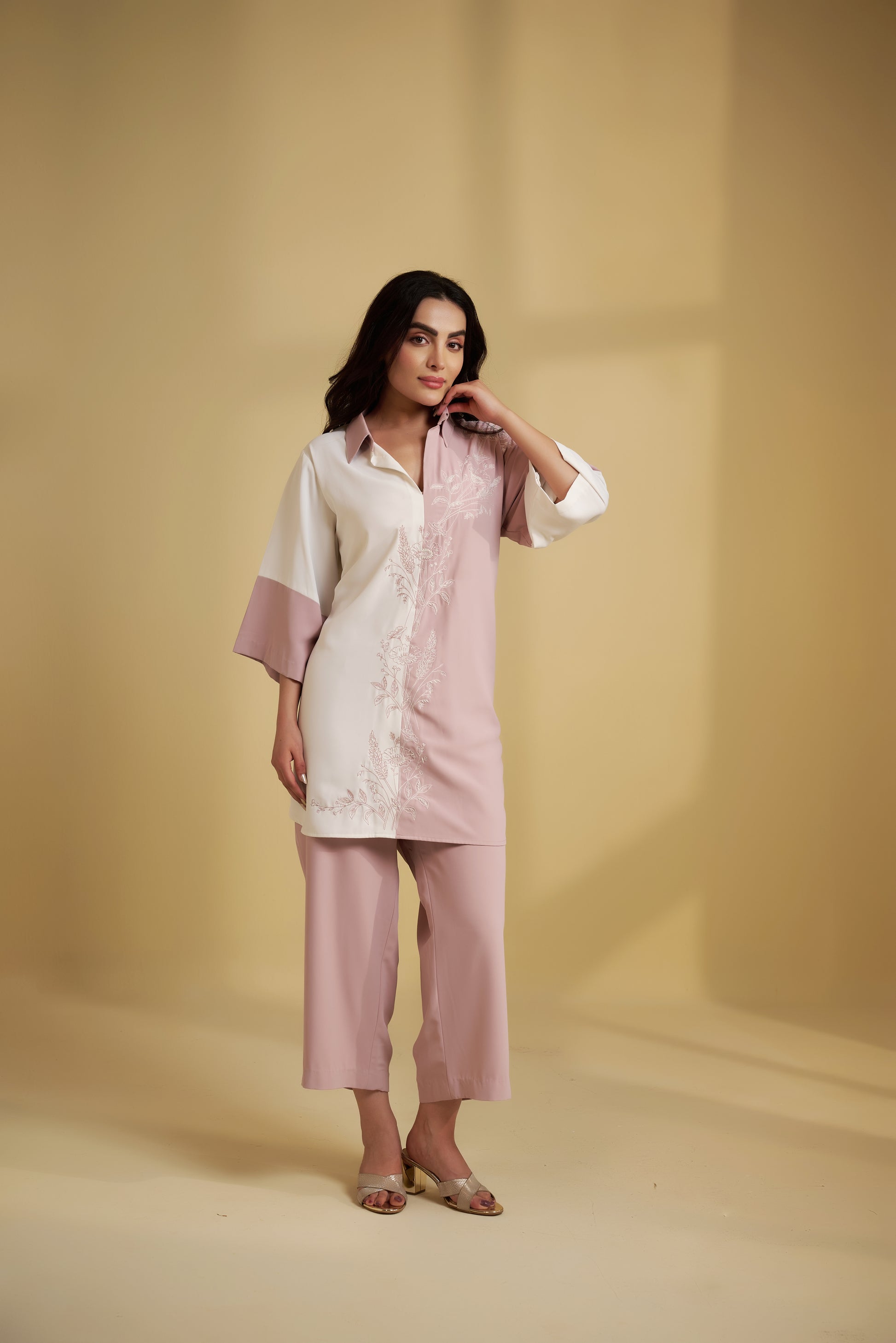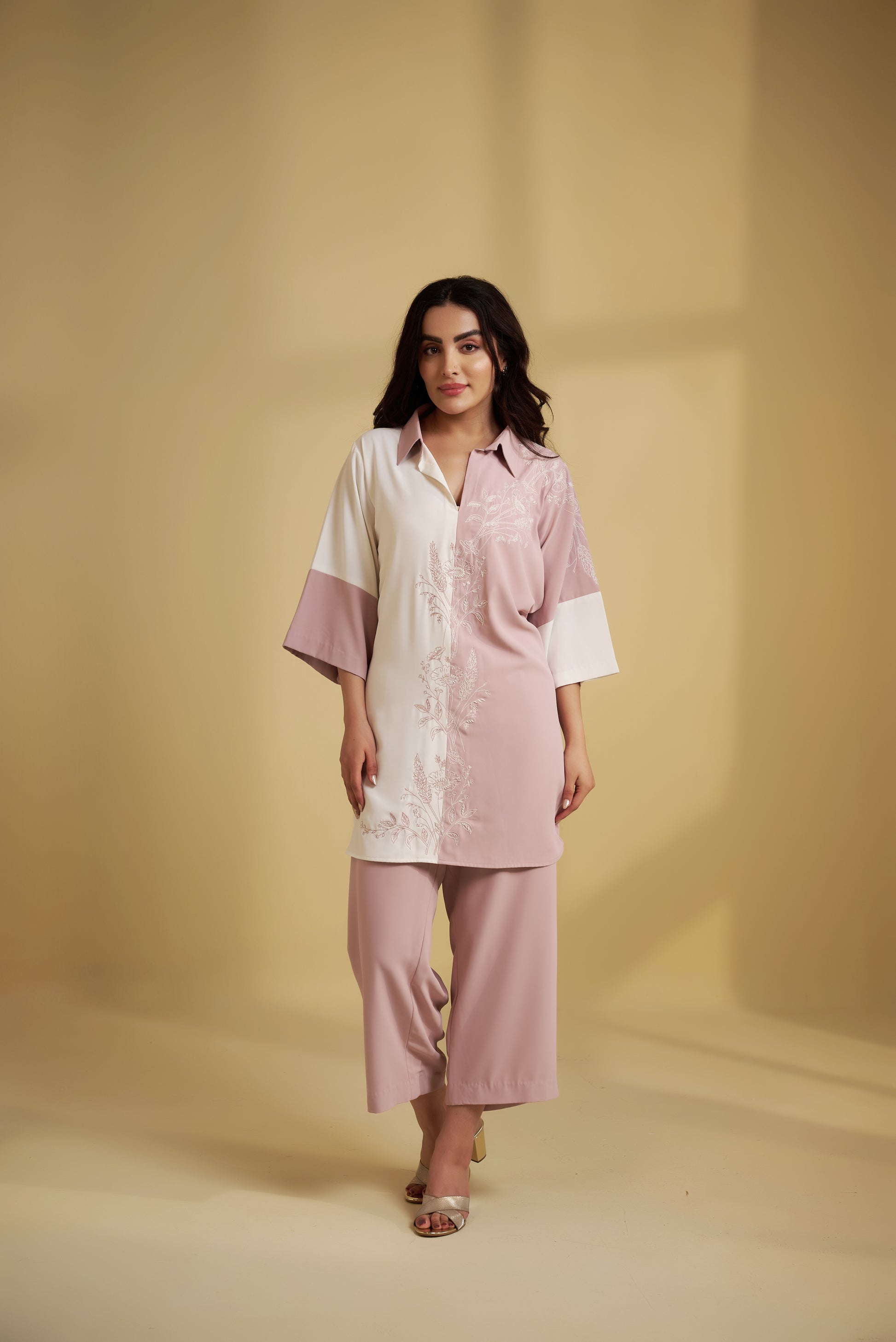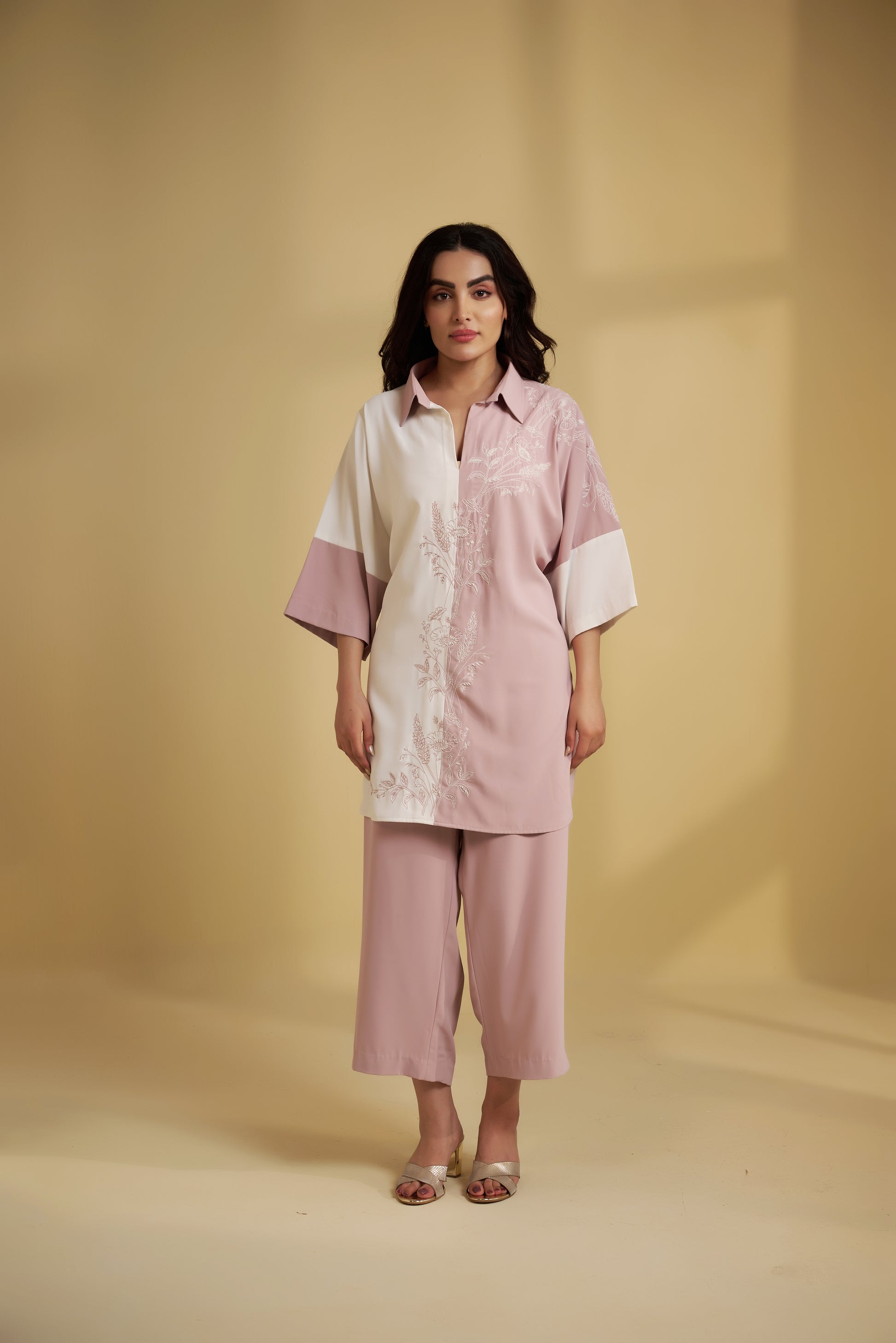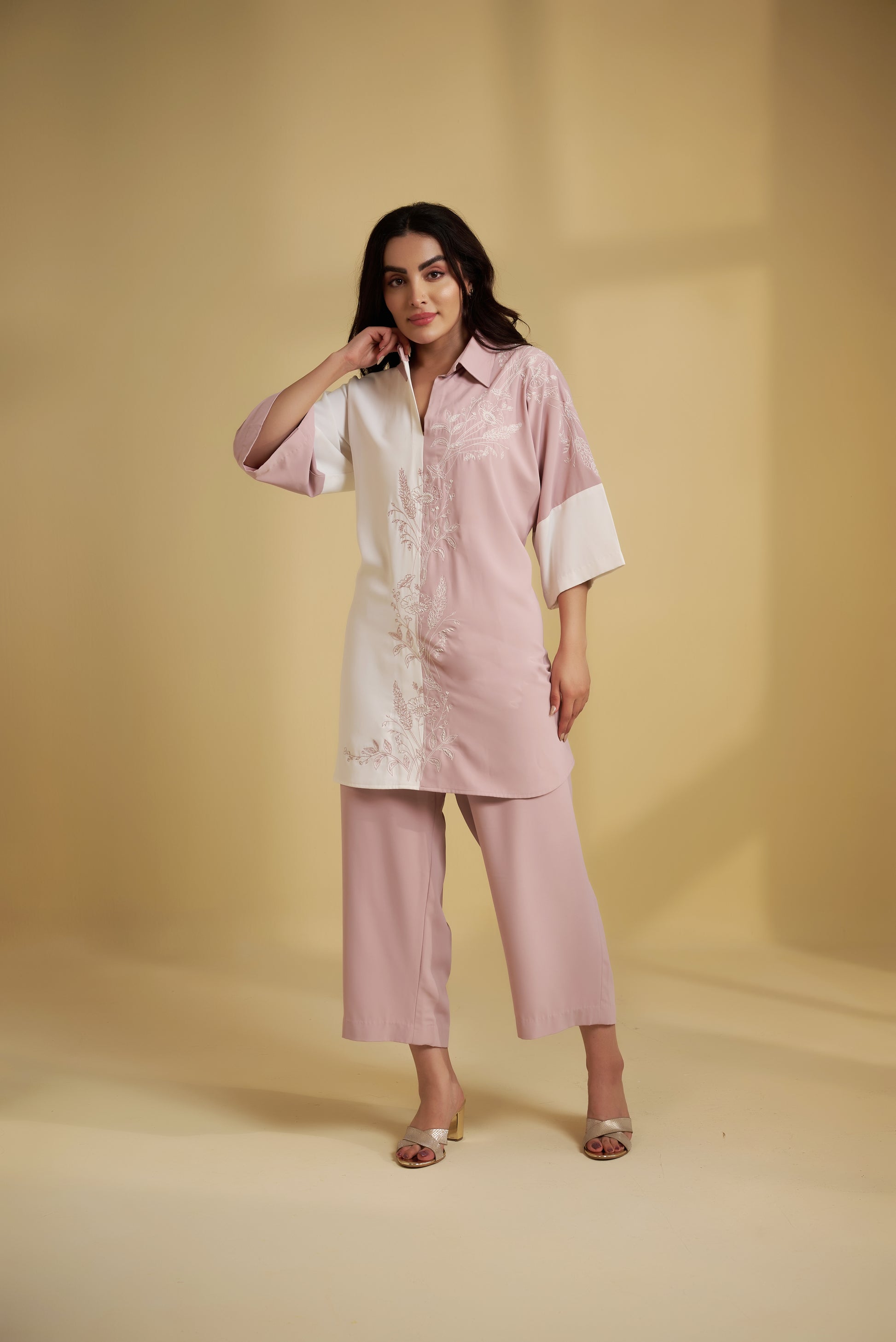 A two tone coord pant set features equisitely delicate thread embriodery that flows seamlessly across the silhouette , adding depth and drama . The outfit is softened by adding fluid loose pants.