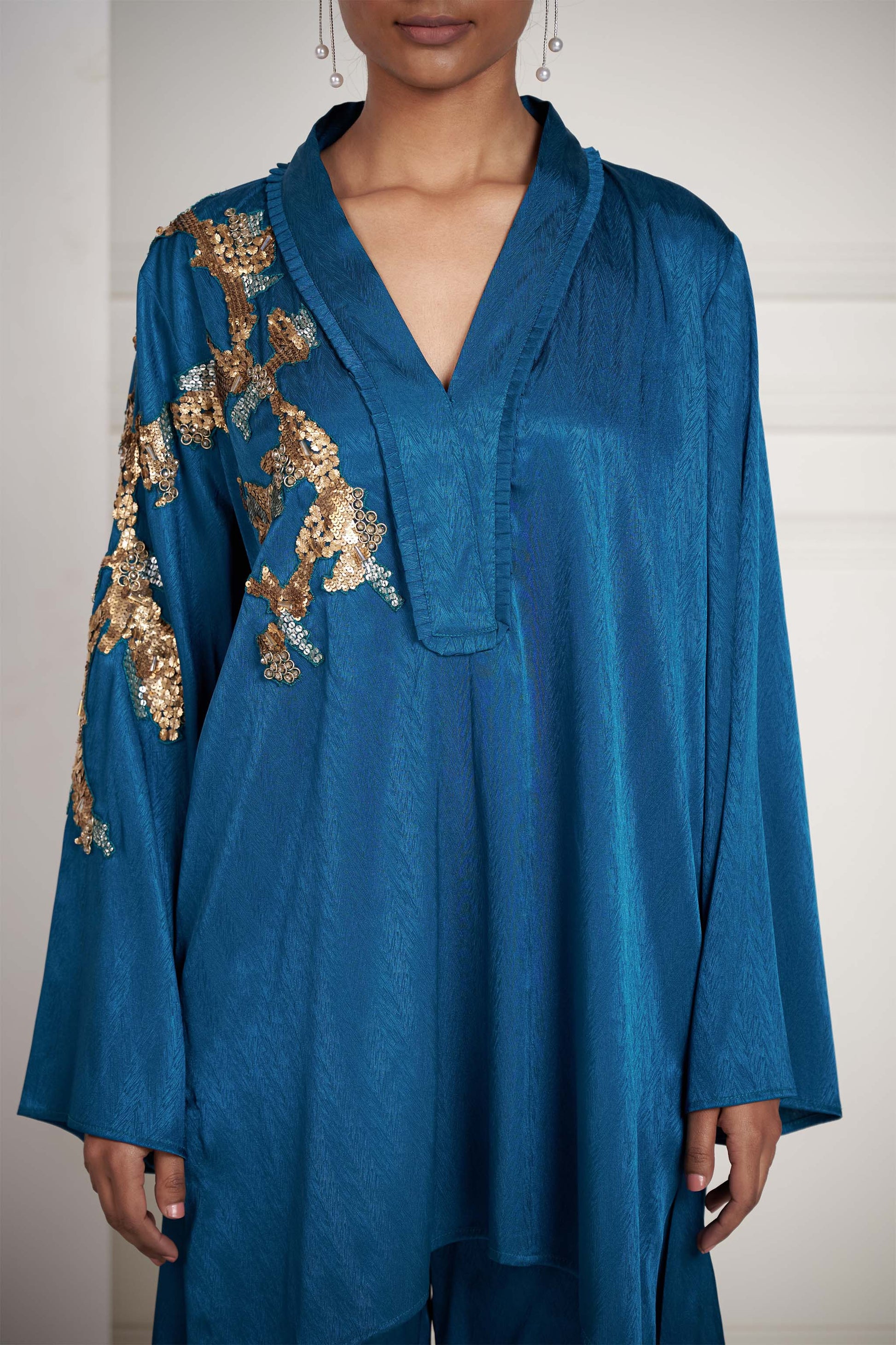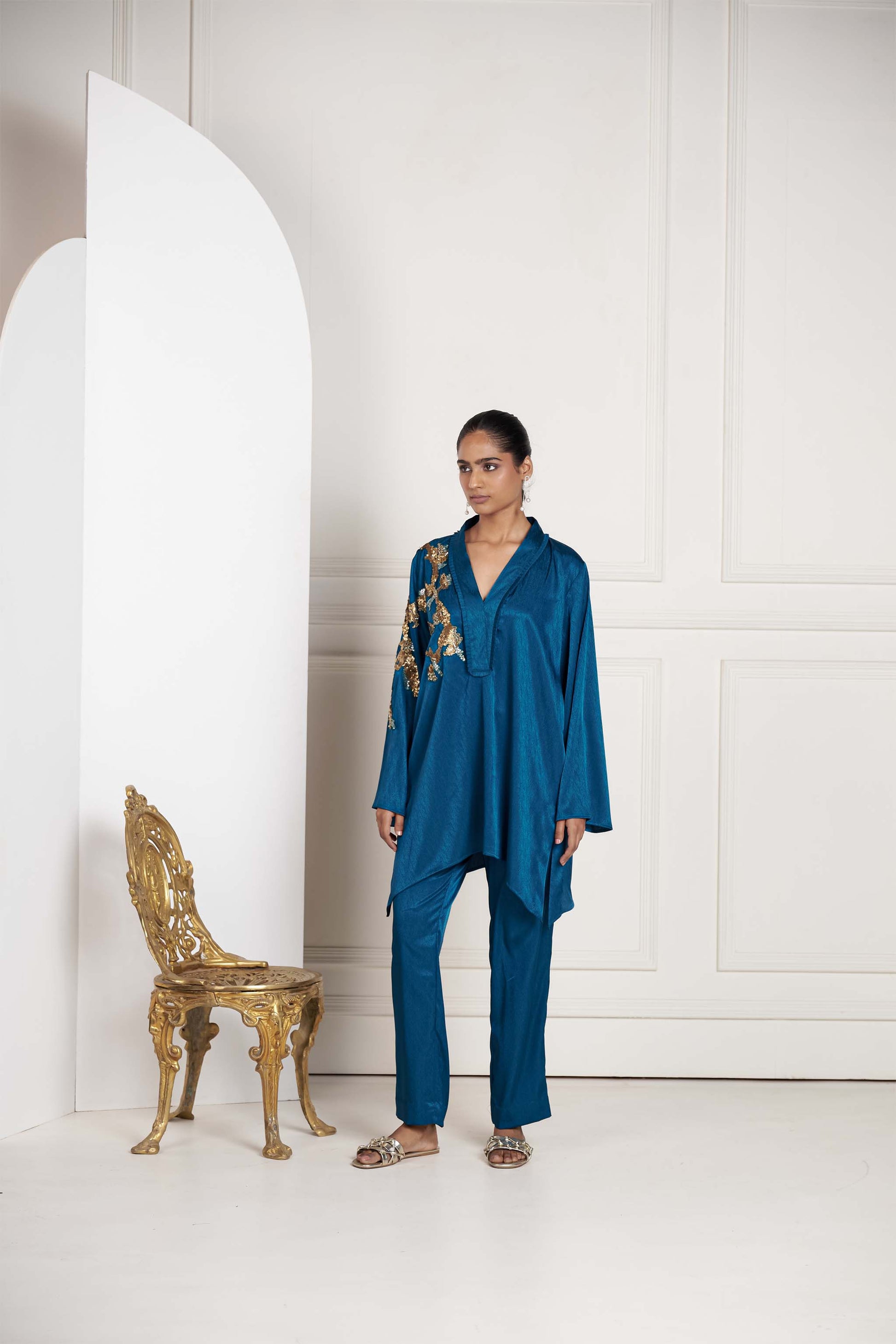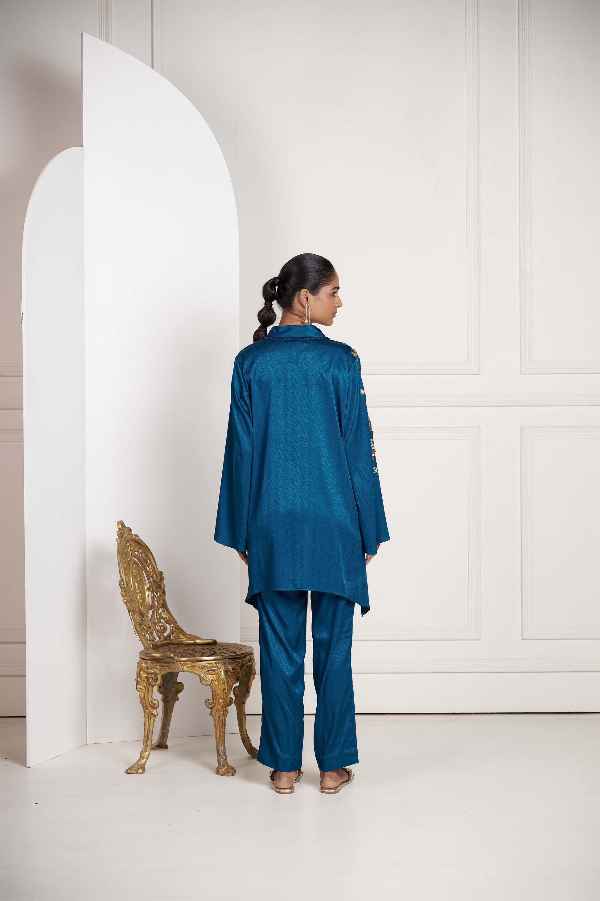 Crafted from rich textured fabric, this set showcases striking embroidery and bold oversized embellished motifs, strategically placed on the side and arms to create a captivating asymmetry. Paired with sleek straight pants, the ensemble balances dramatic detailing with clean lines, delivering a look that is both modern and sophisticated.