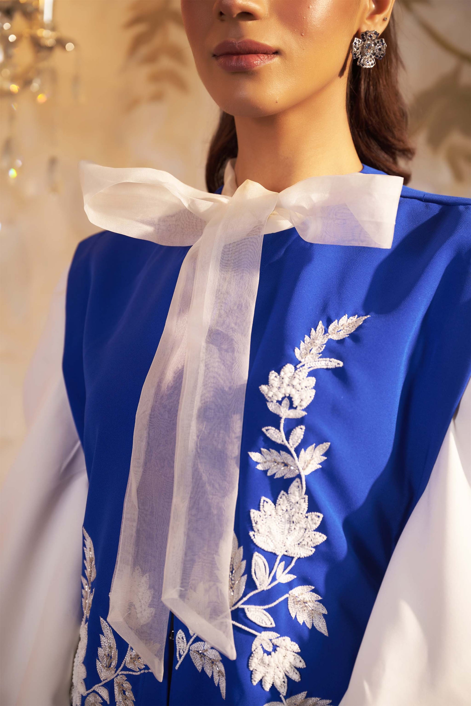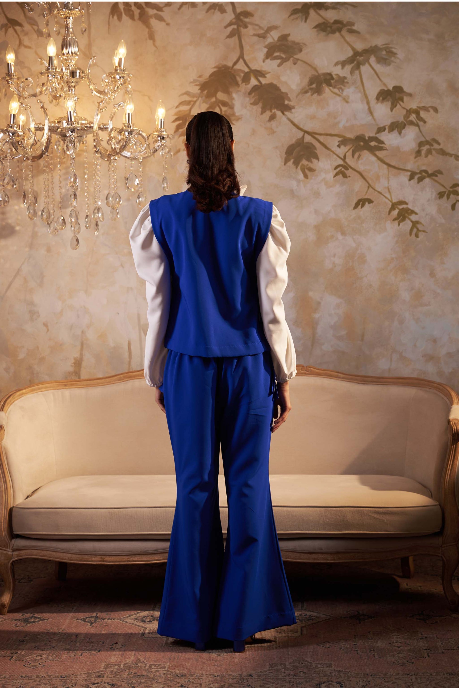 The set features a sleeveless waistcoat with side tie-ups, highlighted with intricate pearl-embroidered motifs, paired with a plain crepe shirt and flared pants, offering a subtle yet luxe detail.