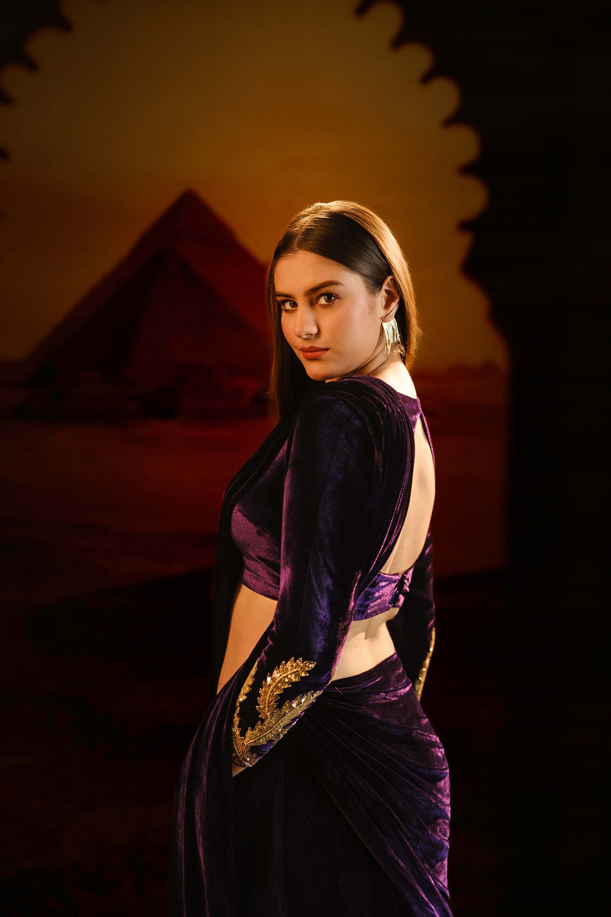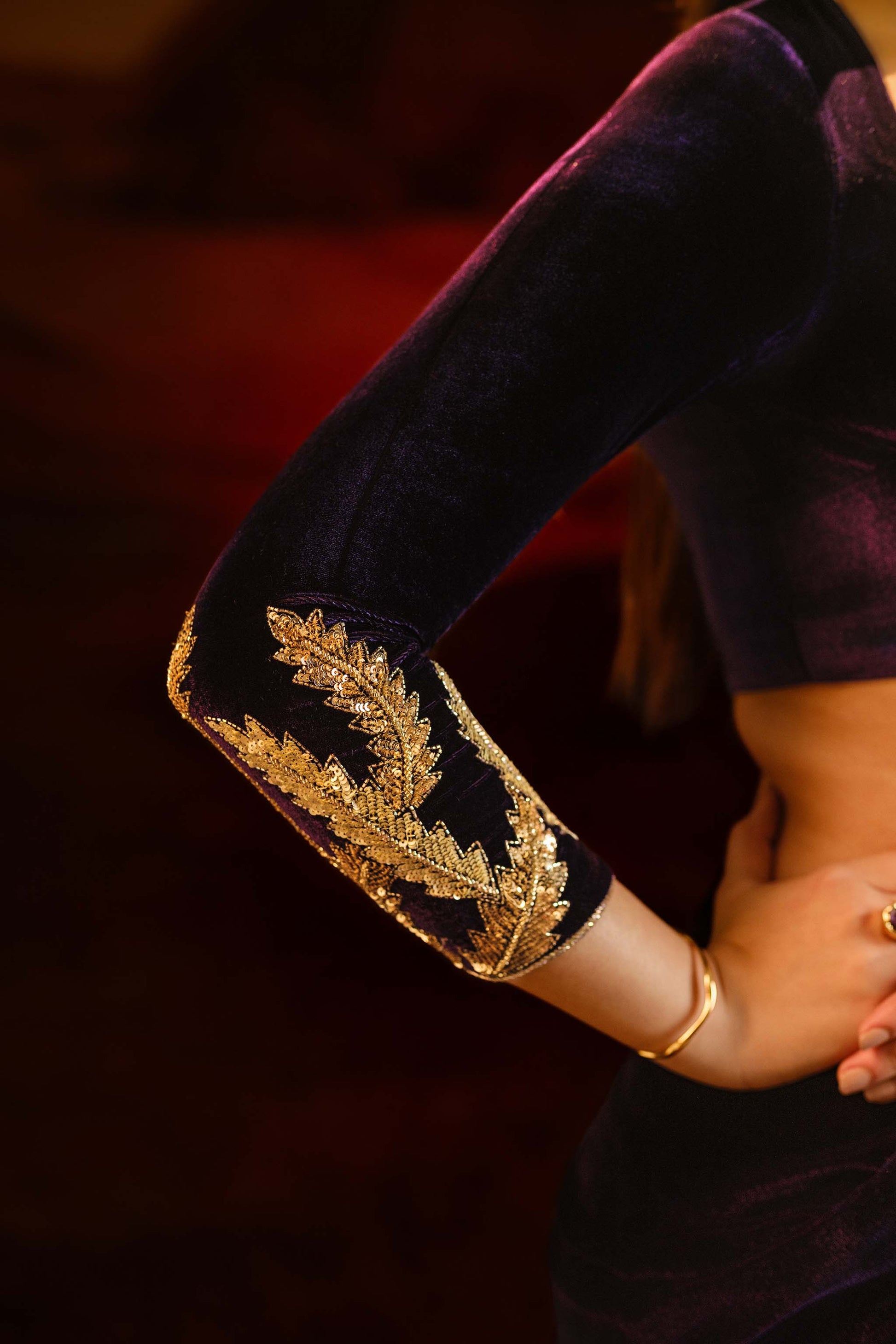A stunning draped velvet saree paired with a beautiful blouse featuring hand embellished sleeves. Rich elegant and effortlessly glamorous perfect for any celebration.