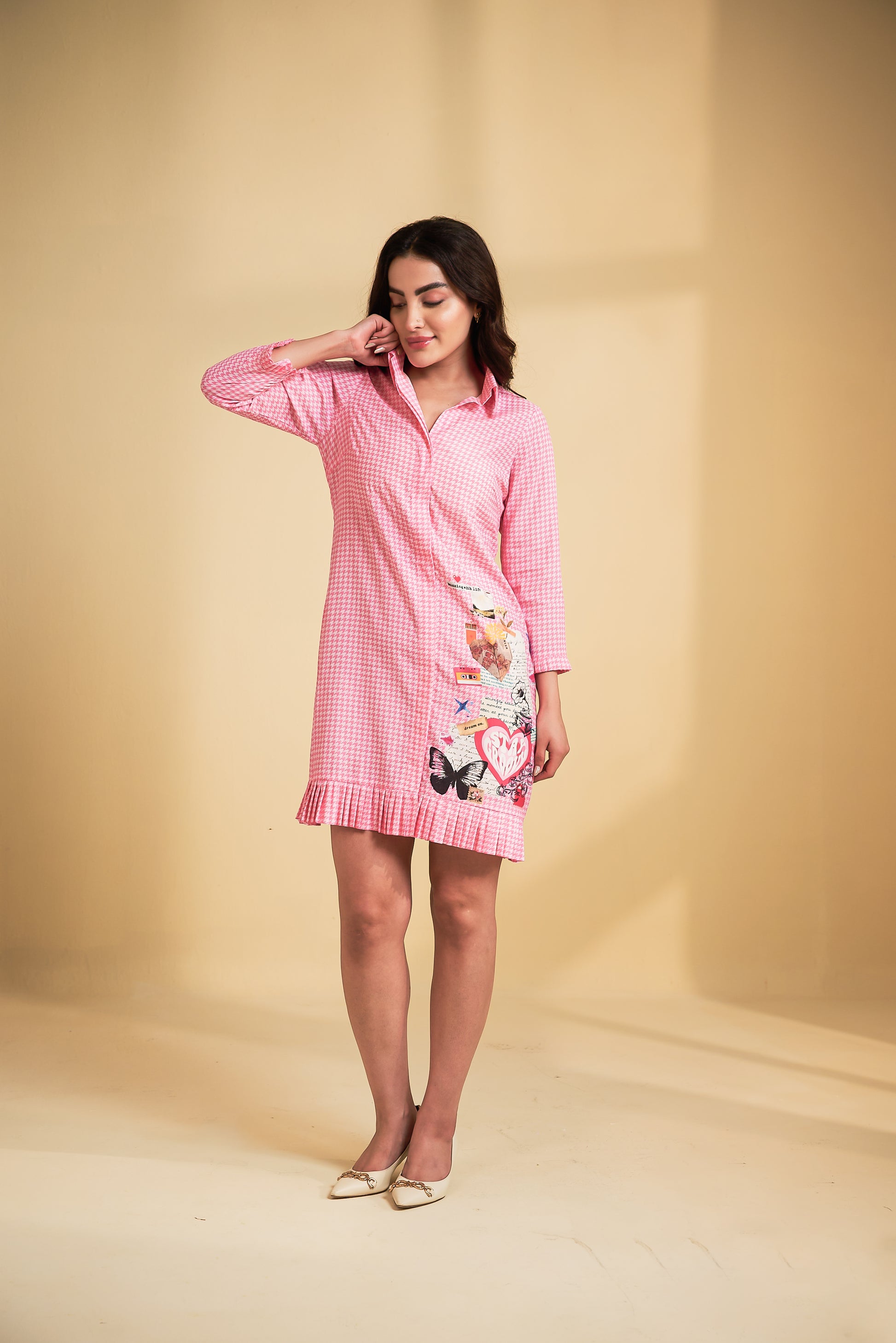 Classic with a twist , this pink houdstooth is reimagined with playful stamp motifs that adds a touch of surprise to its timeless pattern . The soft hues balances boldness and charm , while the unique print detailing sets it apart from the ordinary . a perfect blend of quirky and cool.