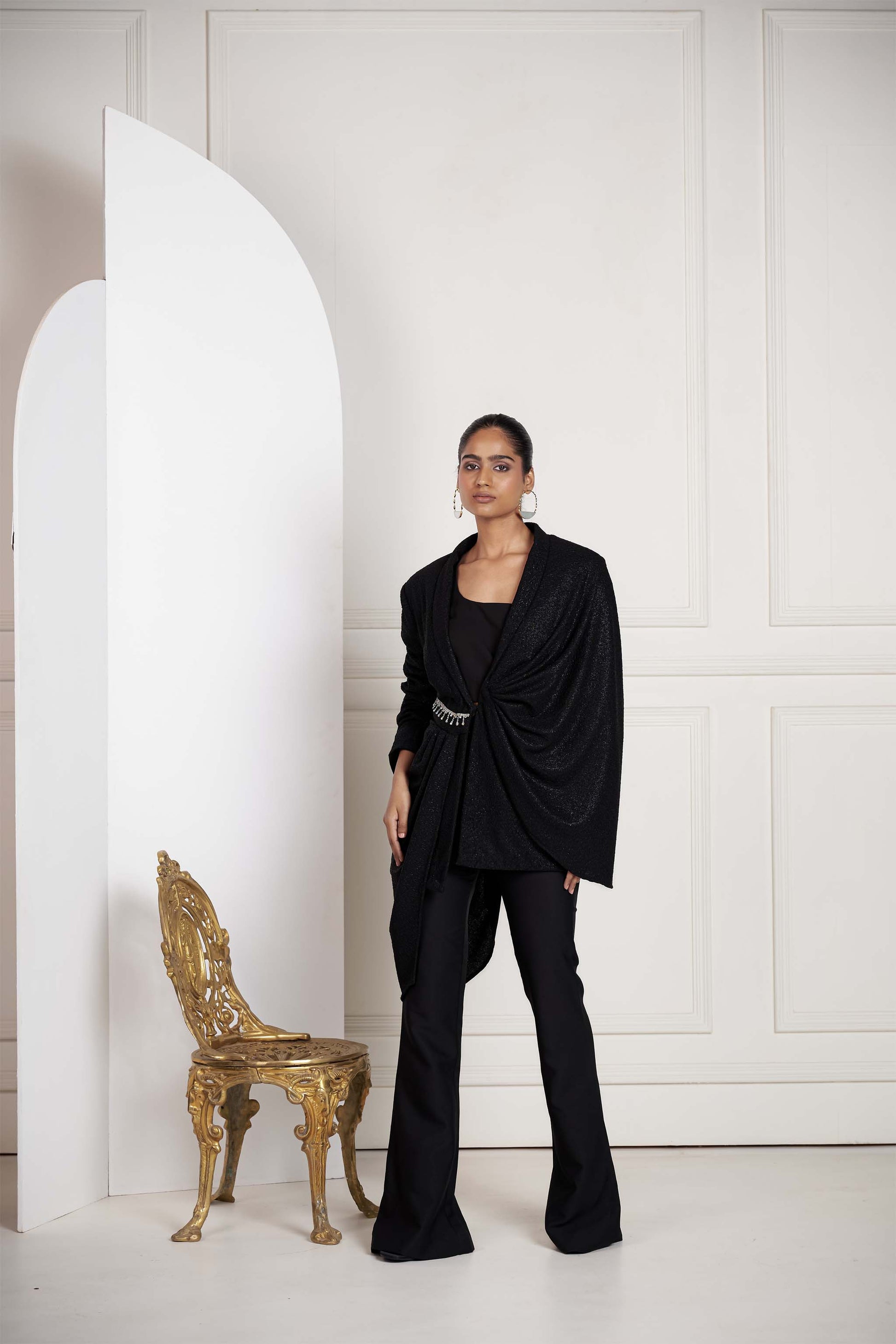 Crafted from luxe shimmer fabric, the set features a beautifully draped blazer with a flawless cut that accentuates the silhouette, paired with flared pants.