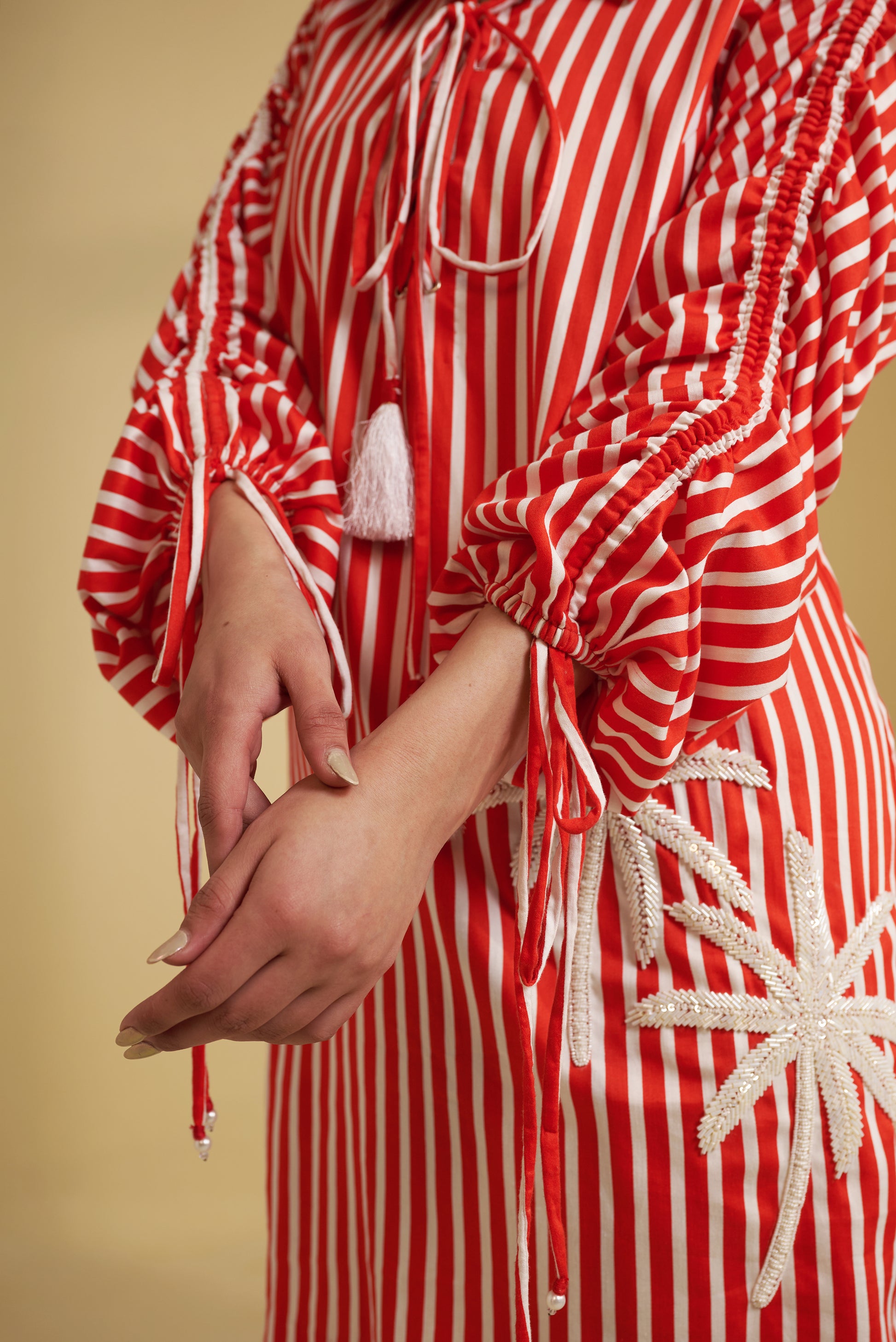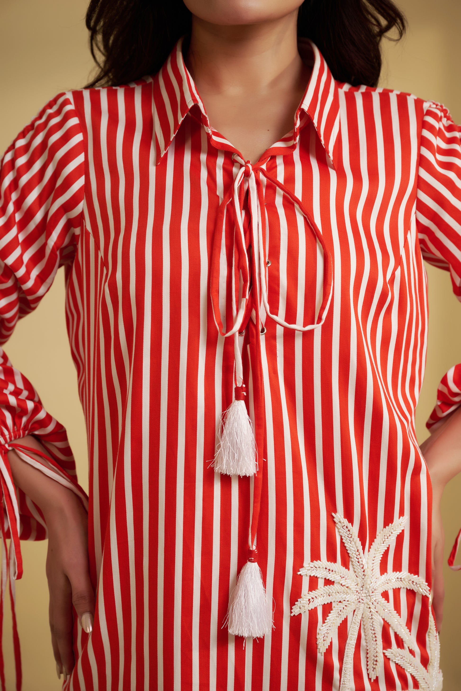 A statement in every stitch - this red and white striped dress features a striking palm tree embellishment that brings a touch of tropical artistry to structural style.
