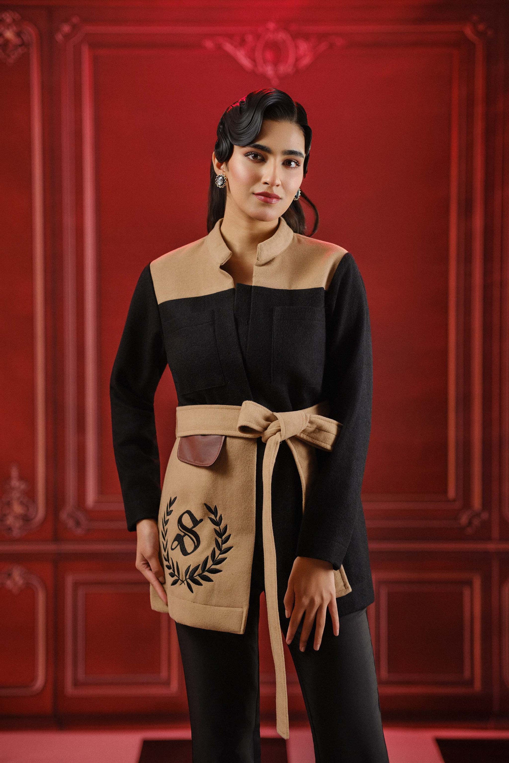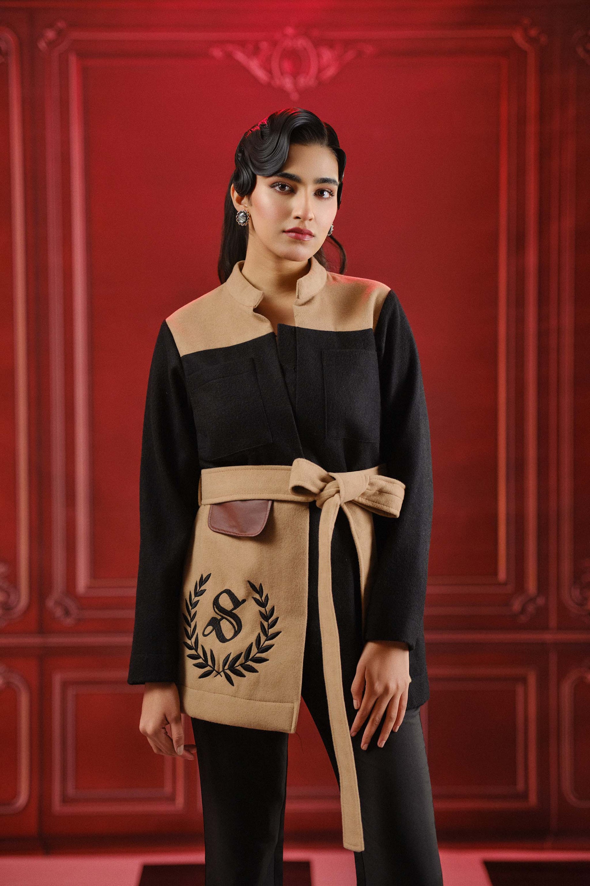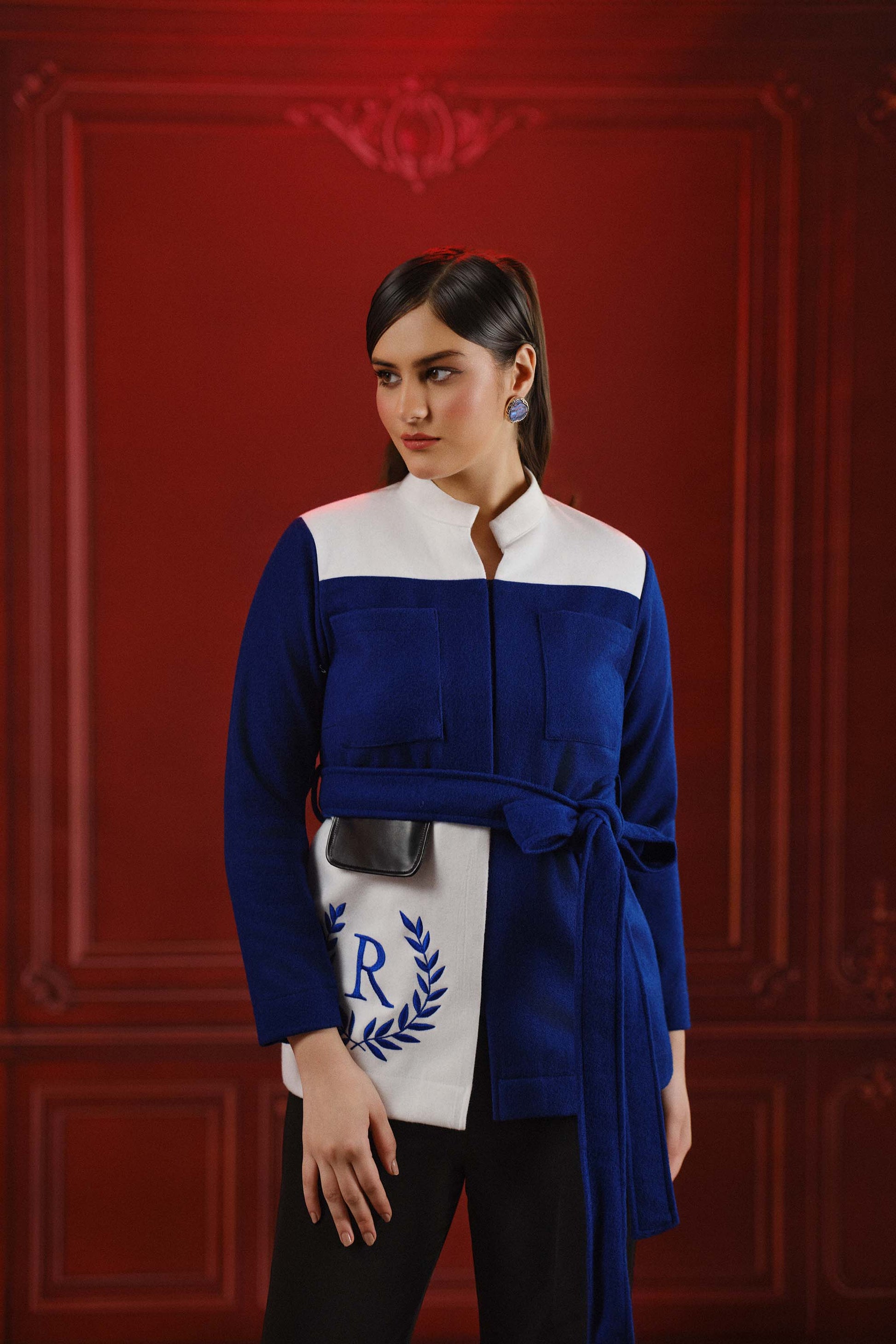 A two tone wool felt jacket with a tie belt offering a tailored customisable fit personalise with your initials for a truly luxe touch.