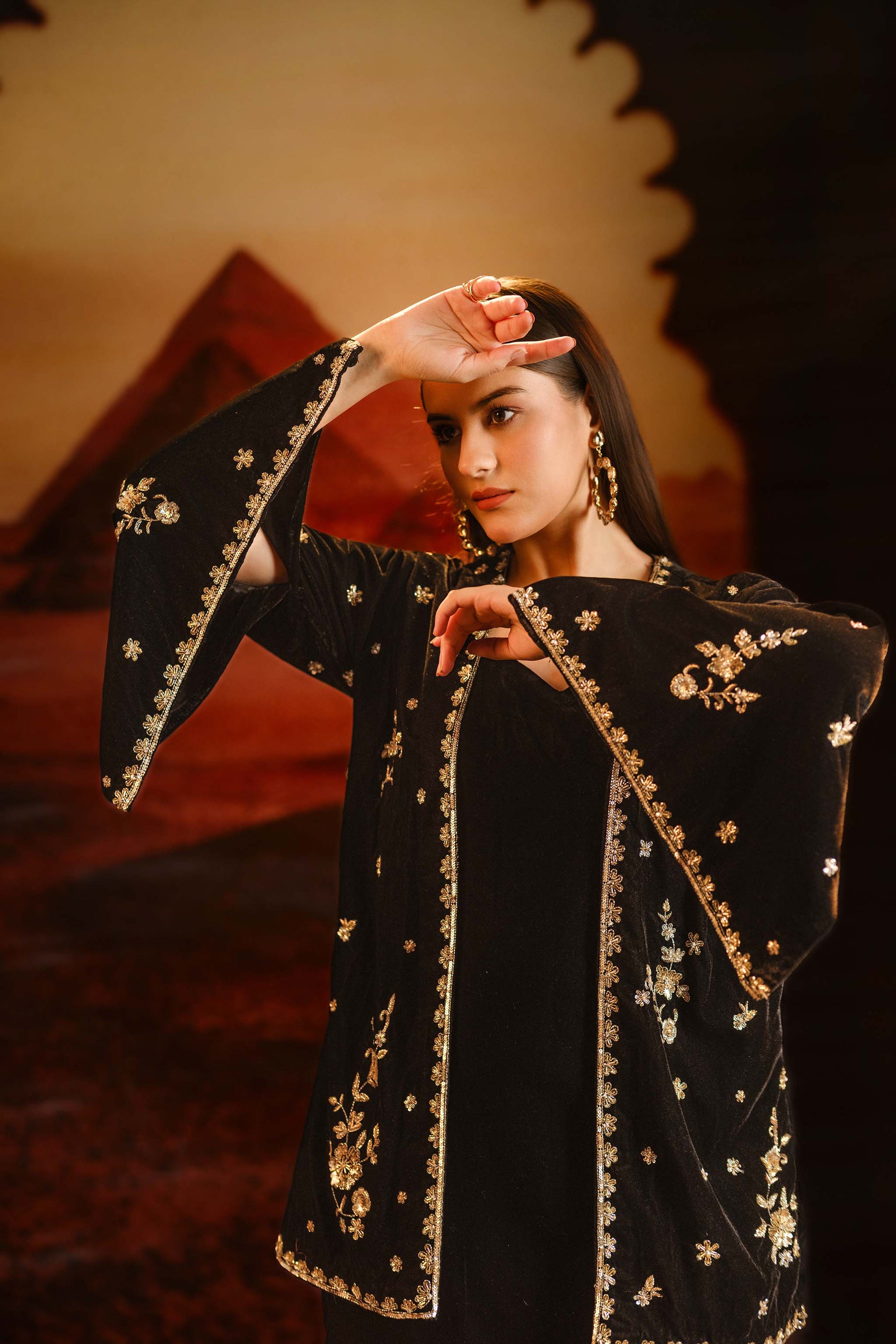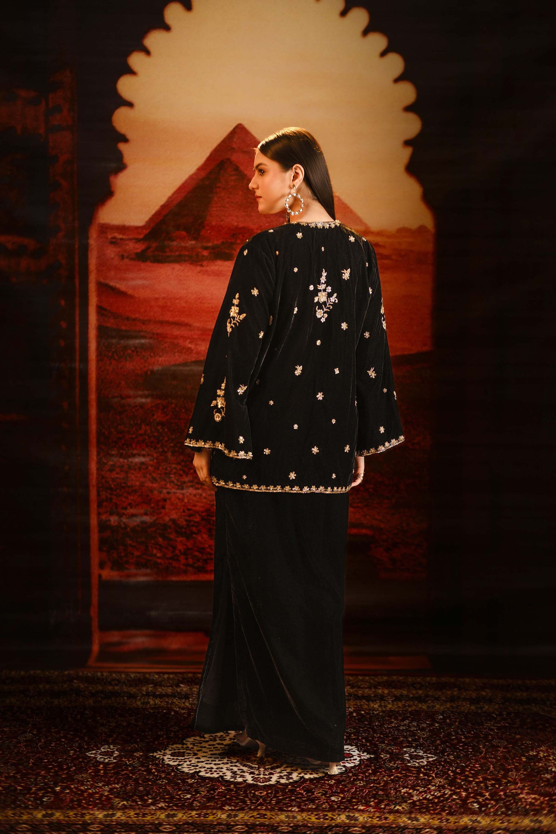 Redefine statement glamour with our embellished jacket and slit dress ensemble. This look features a sleek straight fit dress with twin side slits creating a beautiful elongated silhouette. Worn over is a hand embellished motif statement jacket adorned with intricate rich textured motifs