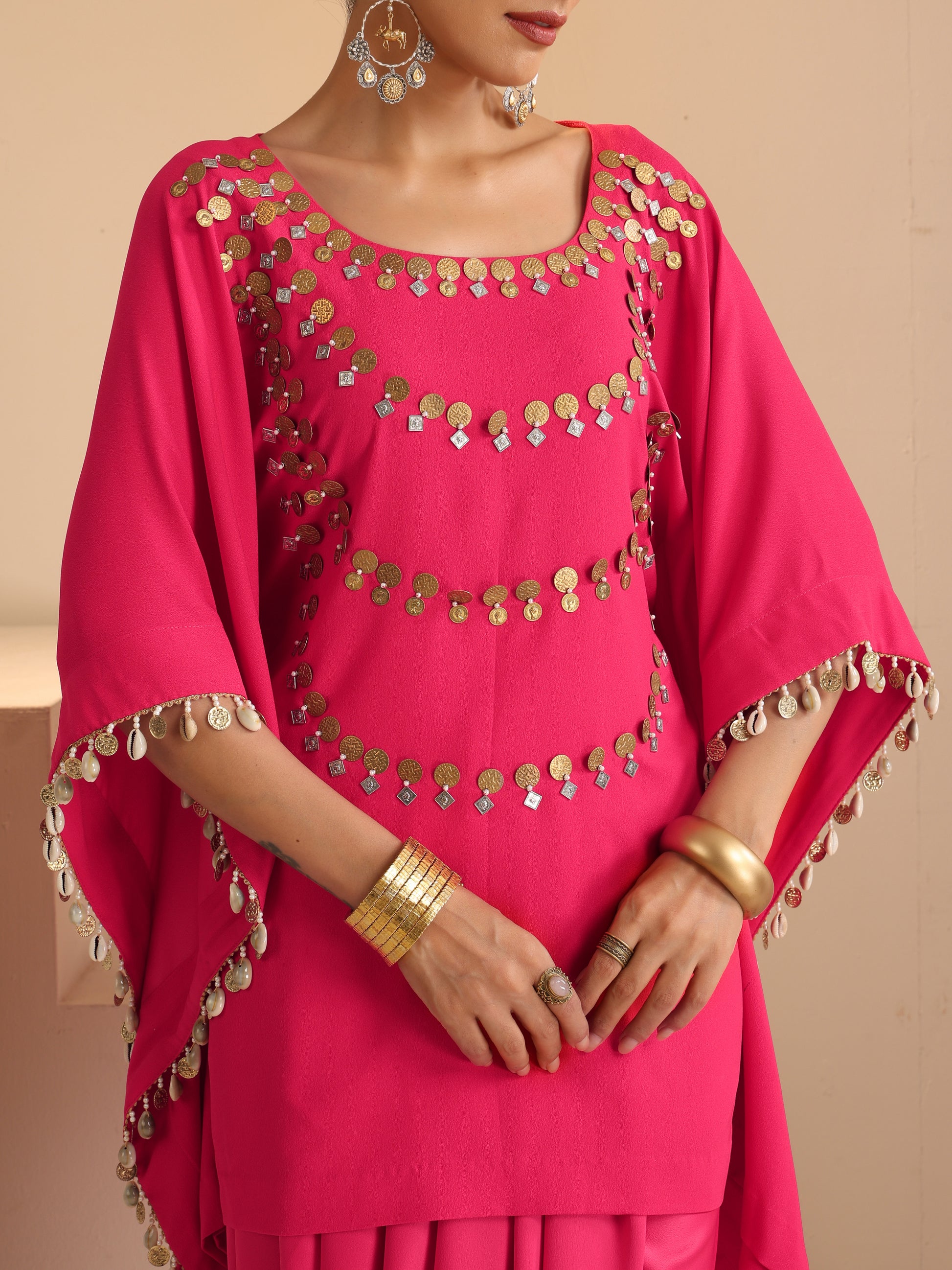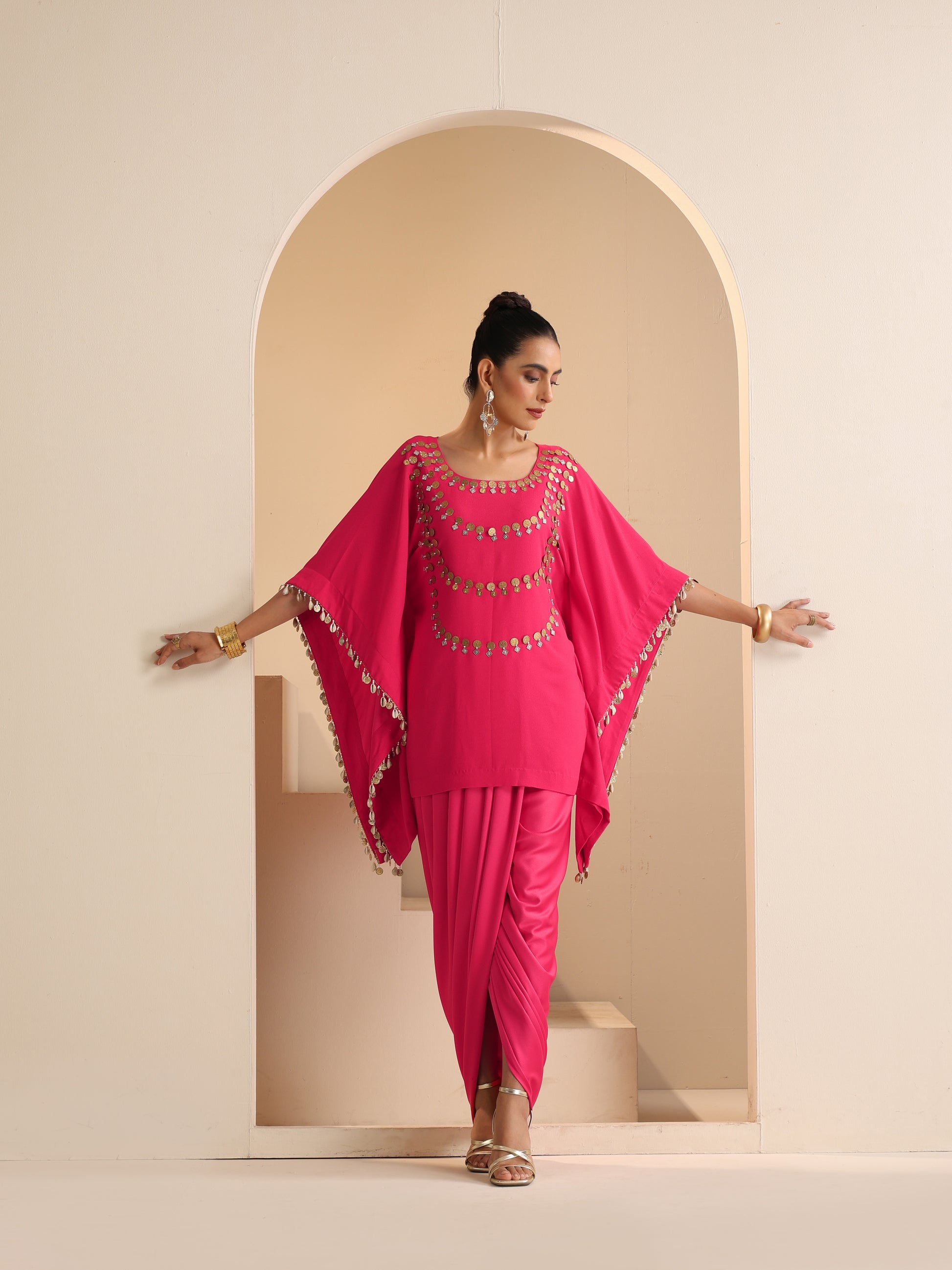 A contemporary twist in tradition- this uniquely cut dhoti is paired with a kaftan style top intricately embellished with metal embriodery.