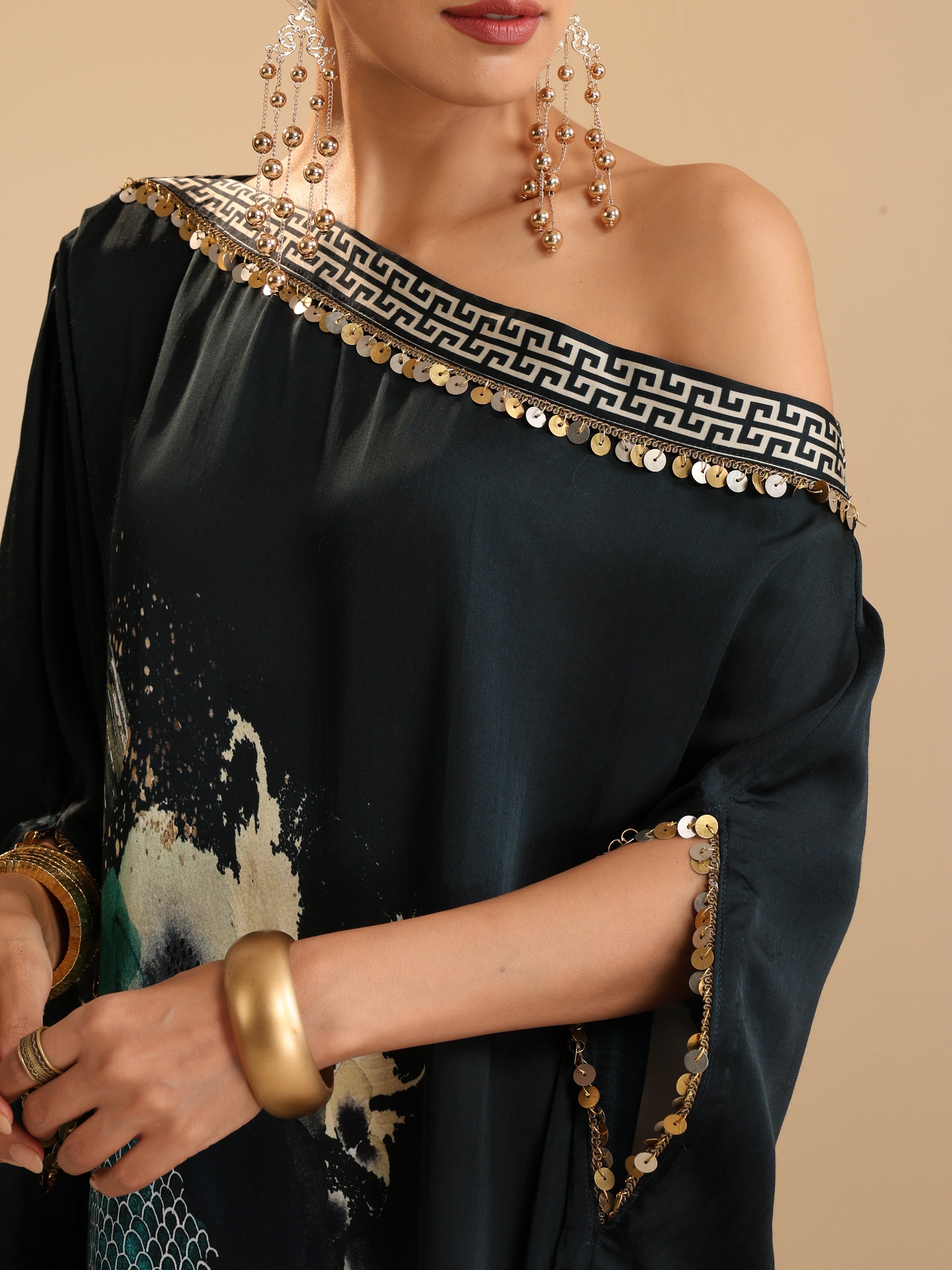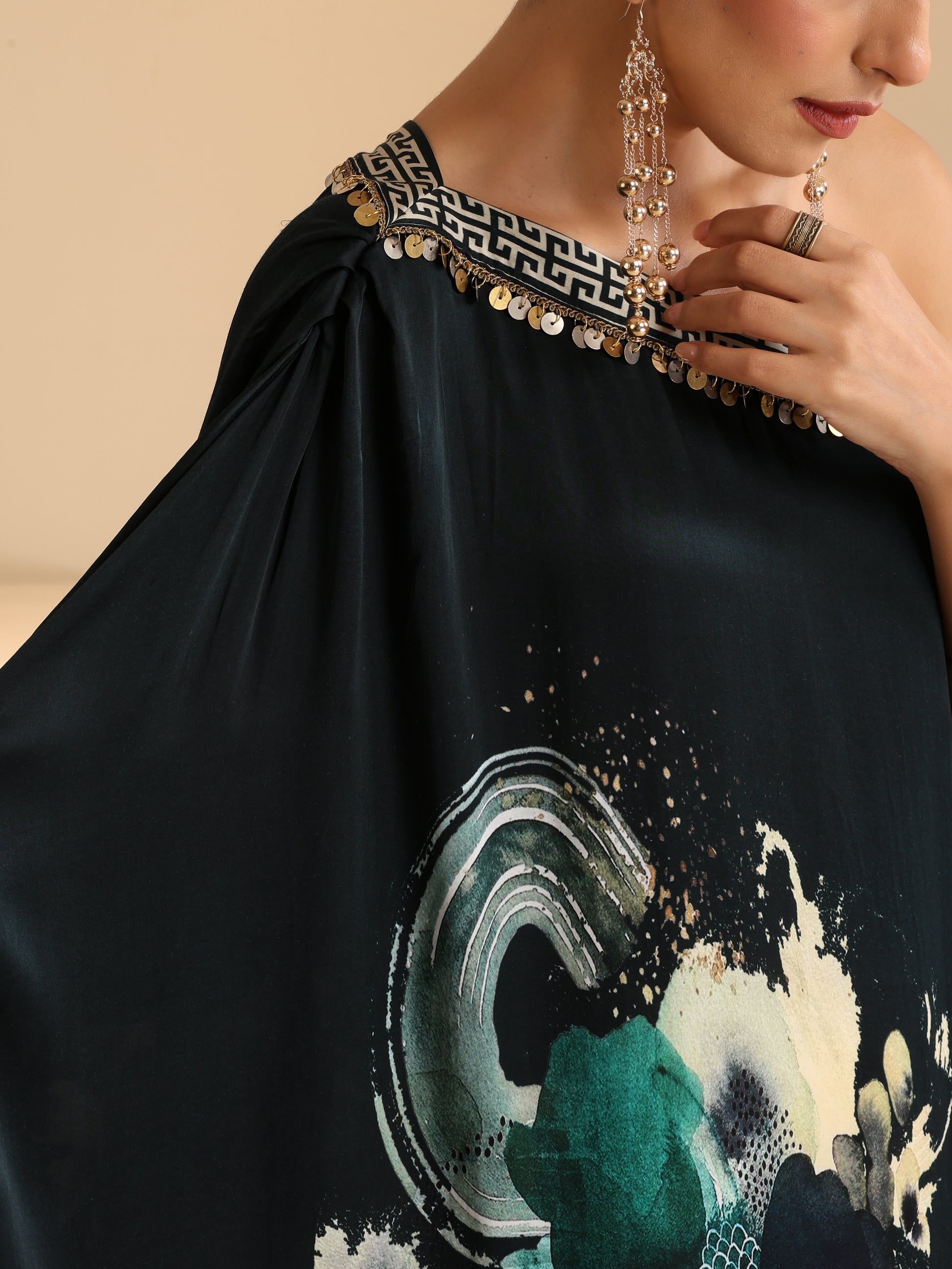 A fluid green kaftan with a elegant drop shoulder silhouette , brought to life with abstract prints and finished with gleaming metal detailing . A perfect balance of ease and statement making detail.